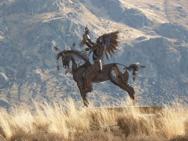 I think reality has become a fantasy and the true story of our time is written in science fiction. Here, for example, is a man holding up a salmon in praise, on old orchard land choked with tumbleweeds just south of the mouth of the Okanagan at Brewster, Washington. The only thing is, man, horse, and salmon are all made of metal.