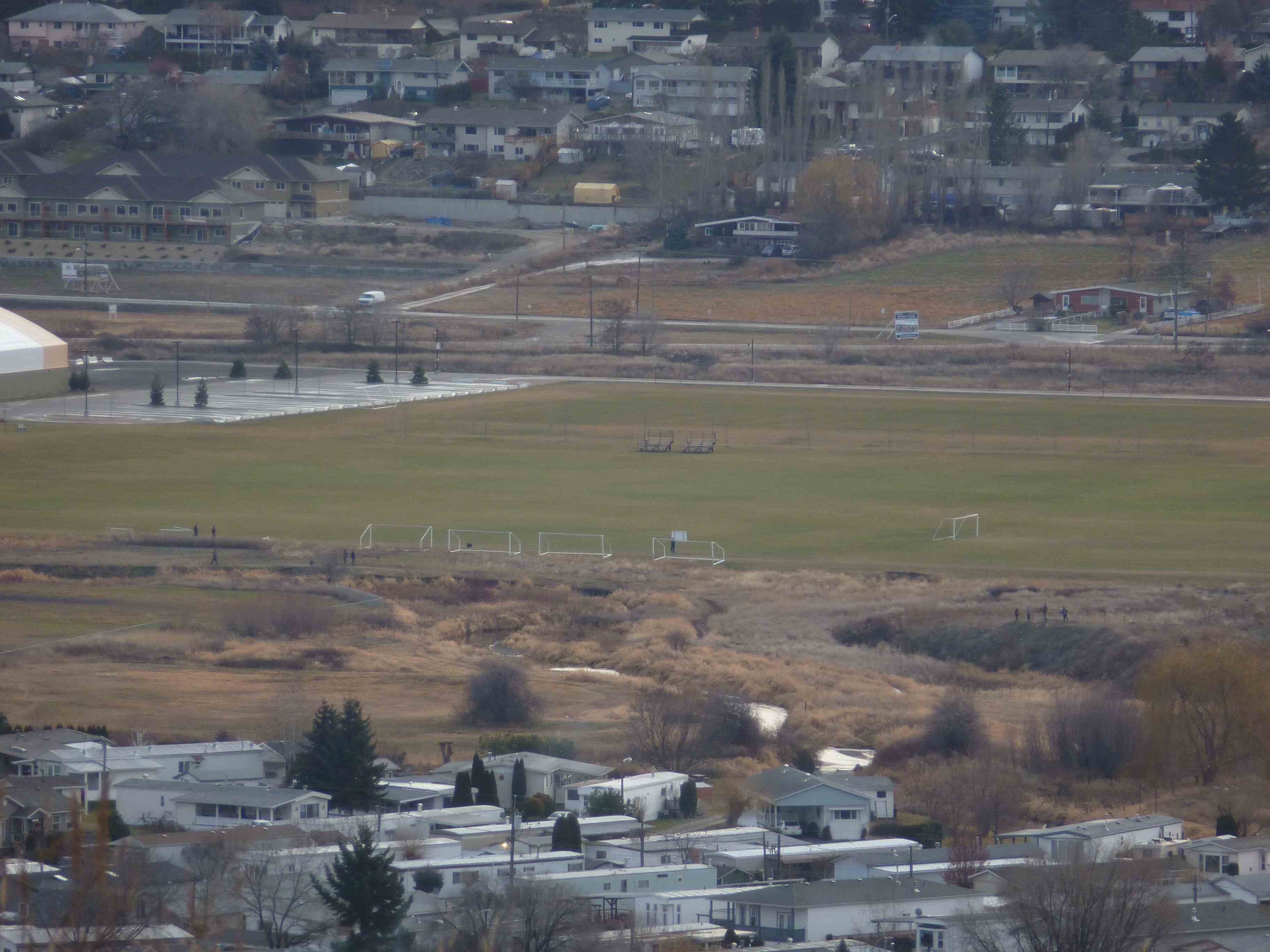 Sharing its space with soccer fields and a trailer park. This is the true destination of the water of the grasslands on both sides of this arm of the valley. If the system is working properly, the water will only enter the lake once it has spent months slowly percolating through extensive beds of rushes here. Note the juvenile humans enjoying this, one of their natural habitats. Note as well the translation of water into recreation, in the terms of the soccer fields — broad transpiration engines, shedding water into the air.