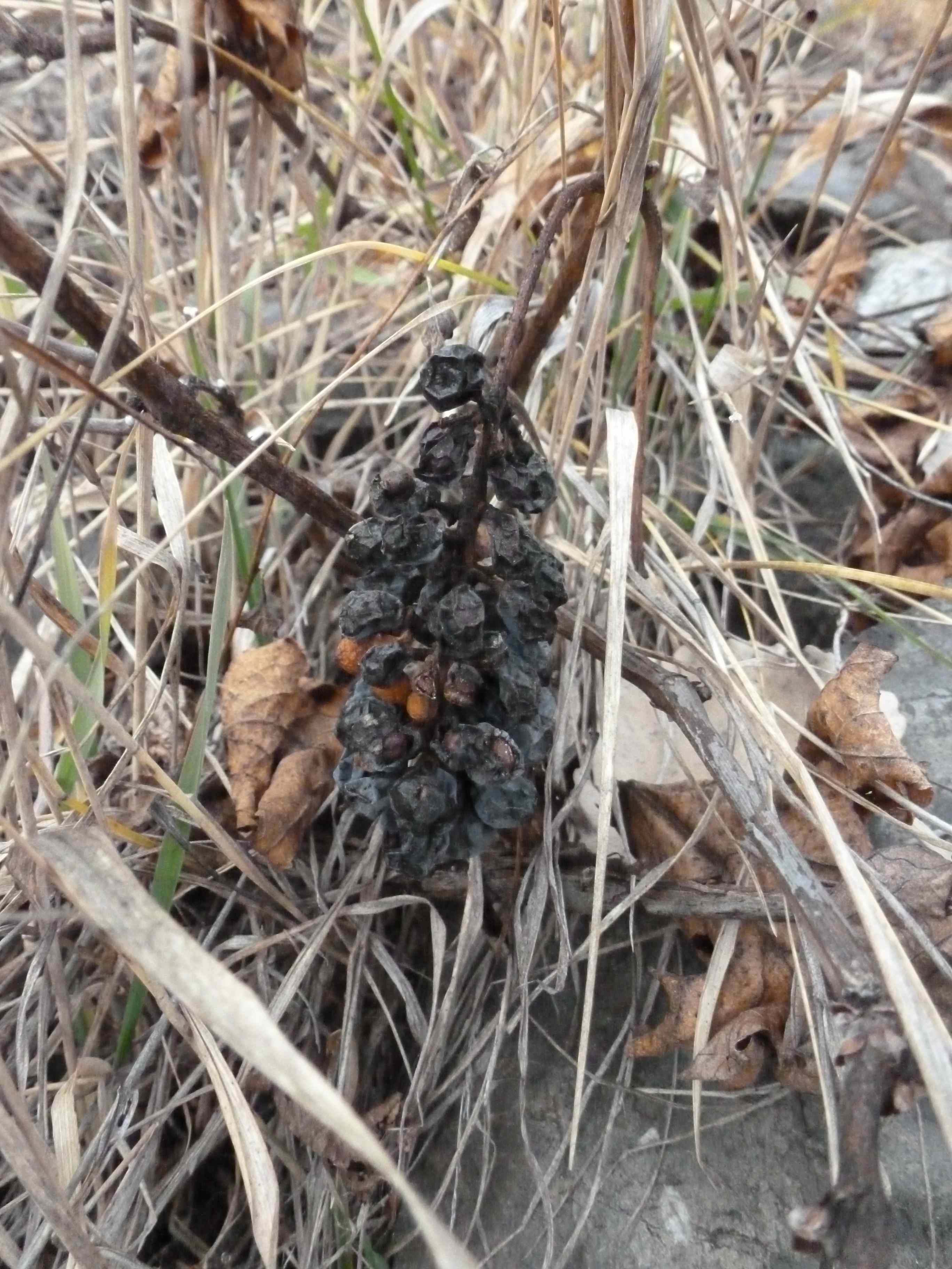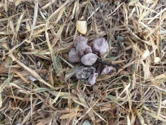 Today, the first of a two-part series on the spiritual and environmental nature of wine, and what it can teach us about productive paths for our society as it works to reintegrate itself with the earth. I start with the notion that the world’s crew of über-technical winemakers (UTW) might draw a lesson from the coyotes. Here’s a bunch of grapes picked by the coyotes in October, that have resurfaced recently from under the snow: