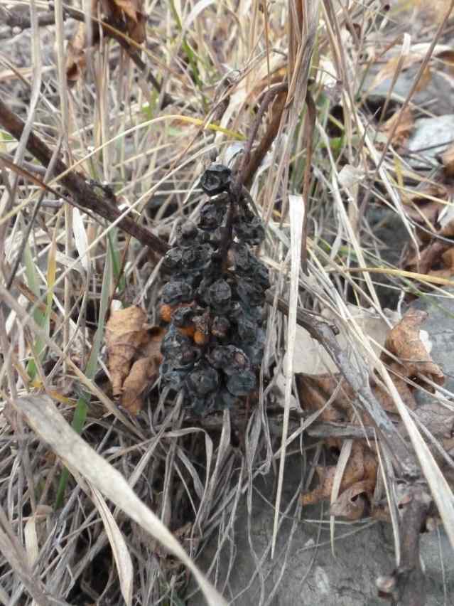 The yeasts are not just freeloaders here. They protect the grape’s skin by fighting off fungi, and each other, as the grape grows and its acids transform into sugars. At the same time, the skin itself transforms into a complex chemical matrix of flavours, acids and colours. As we know from the technical science of winemaking, these some 200 flavours are transparent to human taste until they have been digested and transformed by yeast. In other words, the wine we taste is the record of a complex, living process, which humans have learned how to transfer from skins to juice — which is preserved by the alcohol the yeast give off while doing their work. (In the natural grape, this alcohol evaporates into the air.) To show you what this all looks like, here’s another grape cluster, that also has come through the winter, but has done so still attached to its vine: