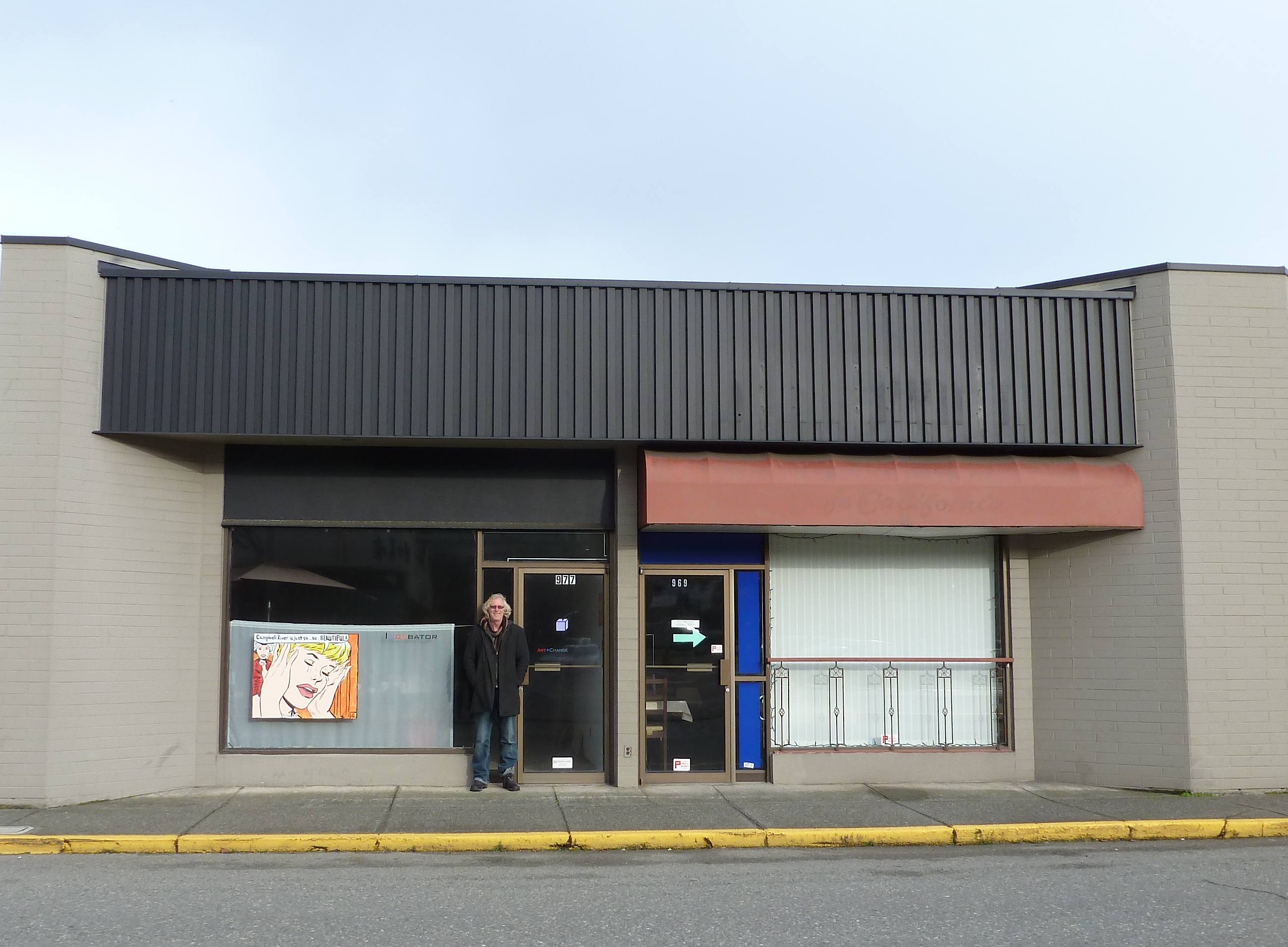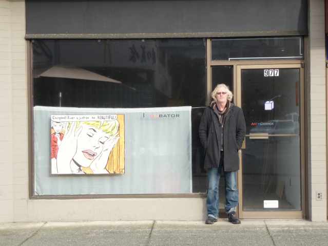 Today, an idea that I’ve brought back to the valley from my years in Campbell River, on Vancouver Island, where the sculptor and painter Ken Blackburn has worked for years to free sculpture from materials into sculpture of community. Like much of the Okanagan and the Okanogan, Campbell River has a surplus of unused and underused urban and industrial space. Ken has developed strong partnerships between the arts community, the arts council, the John Howard Society, a variety of public boards, the city administration, and the real estate community. His new project this winter is a partnership between the arts council, artists, a landlord, and a real estate company. It’s pretty exciting, and it’s transferable. Here’s what it looks like from the street: