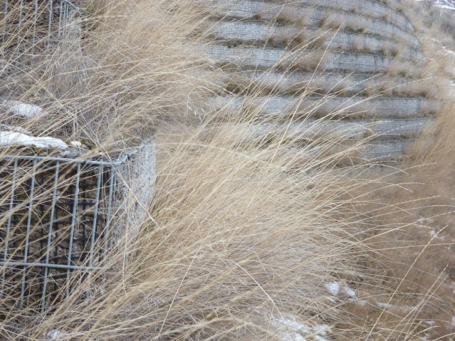 This soil is one metre above the miracle of the retaining wall shown in the previous image. The soil crust here gets eroded away as quickly as it gets established … but then it is caught by the wall below and given a chance to farm the sun. Who said farms have to be horizontal? Hundreds of square miles of road cuts await us.
