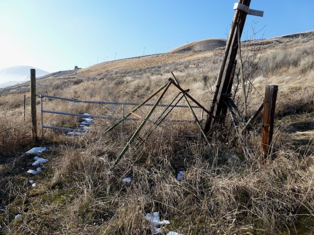 Note the new road cut into the hillside in the background. The gate doesn’t open. Deer go under it. Humans go over. The swing doesn’t swing.