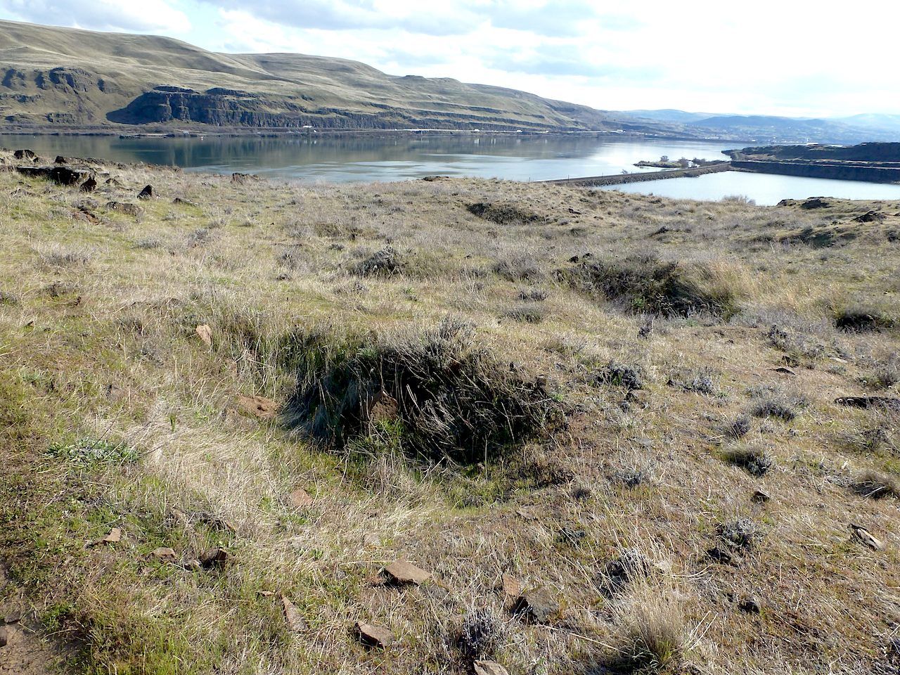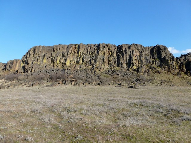 The river down below was once the site of many petroglyphs — all drowned by The Dalles Dam in 1957. When the explorers Lewis and Clark asked the Umatillo people who made them, the answer was “The River People.” In other words, even they didn’t know. They’re that old. Here’s the flooded river, from the southern base of the butte, looking south to Oregon: