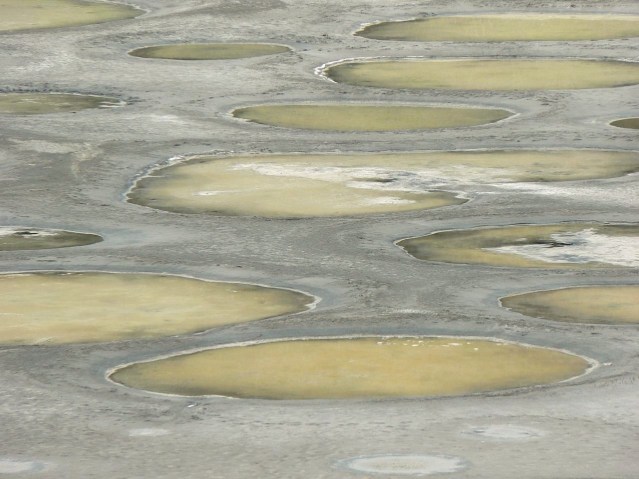 Magnesium Sulfate, mostly, but about a dozen minerals overall, including titanium and silver. During World War I, an entrepreneur in Tonasket, Washington, mined the lake for chemicals, which he hoped to sell for the manufacture of munitions to be used in Europe. His pile of salts came to nothing. Since that day, the colours have taken a step down in brilliance.