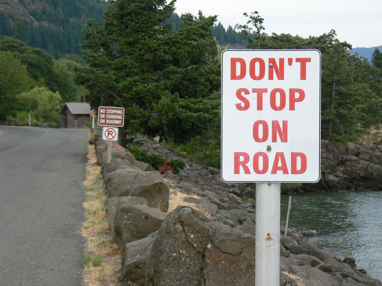 At least this sign is posted at a rest area, which has parking, although you have to pay $10 a day to use it. I think you can guess that no one does. Imagine the frustration! If people would just, like, you know, get with the program, eh.