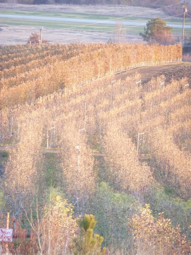 Sometimes called a high density apple orchard in the late afternoon light.