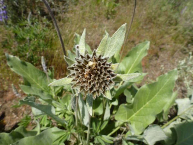 Arrow Leafed Balsam Root gone to seed, with occupant. This seed head is this spider’s universe. She drifted here on a thread of silk, carried on wind generated by the heat of the sun. Any space traveler that lands here, will be hunted down.
