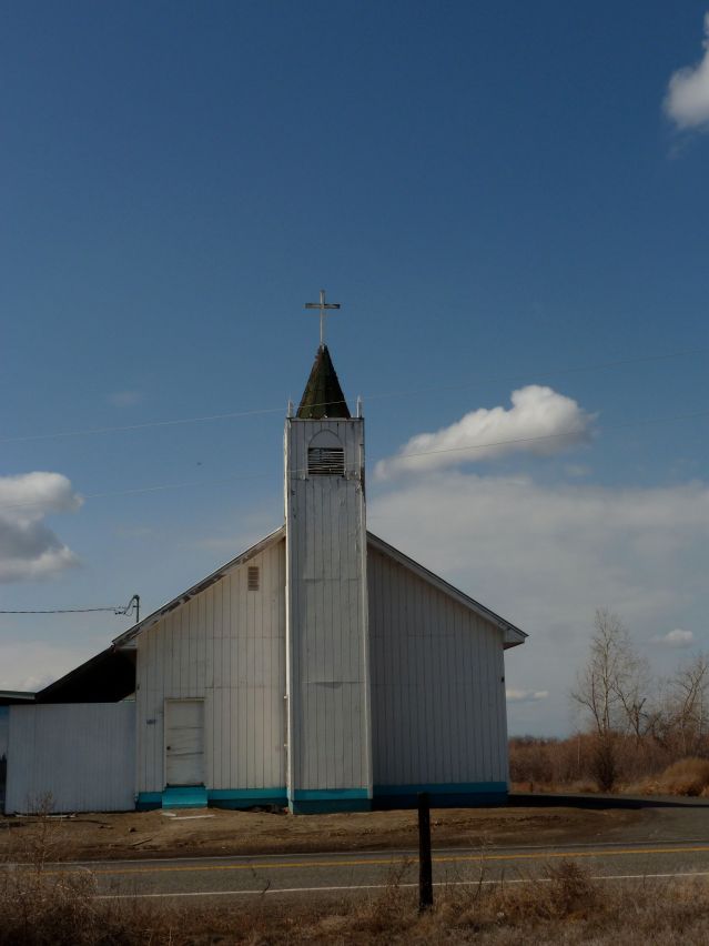 This is the first barrier that the Okanagan salmon returning home from Siberia encounter, smack dab in the middle of the Columbia River. While they negotiate the fish ladder (it begins at the white water to the left of the photograph) and struggle on up into the organic machine that is the Columbia now, the turbines of the dam are spinning around and around, converting the gravity of the earth, the gravity of the sun, the gravity of the Milky Way, and ultimately the gravity of the Big Bang into electricity. This is what church looked like in its most modern form in the 1920s.