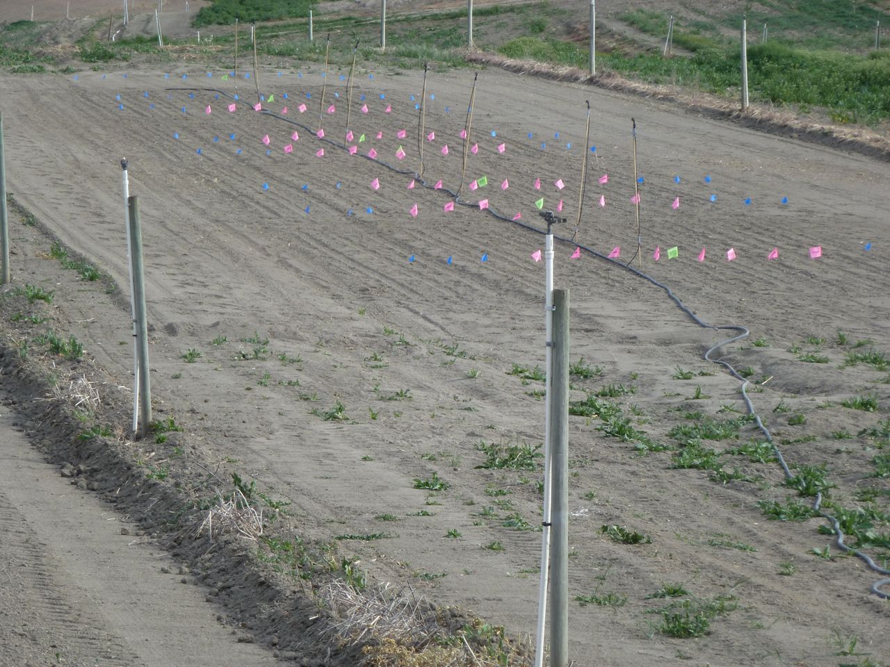 Agricultural test plots in preparation for being wrapped in shadecloth, on old orchard ground heavily cropped for years by corn. Notice the compaction of the fine, non-organic lake bottom soils, and the scrubby crop of weeds. This dirt is unwell.