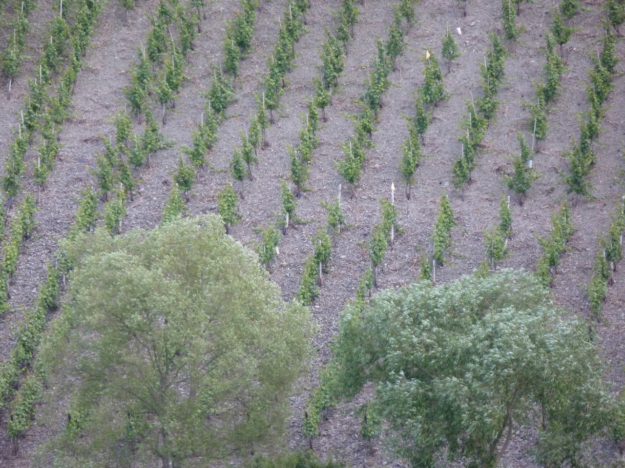 Lots of air, lots of water, and it only moves downhill a bit every year. Here are some riesling plants enjoying it…