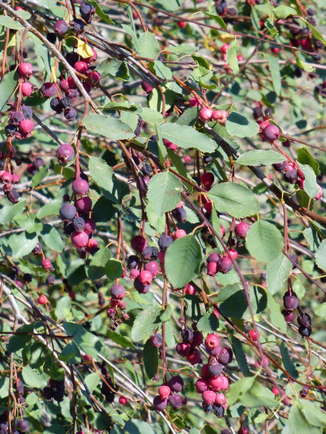 Saskatoons were once a major human food source in this area. Notice how the fruit ripens over a period of weeks. If a flock of birds or a giggle of humans and bears comes by to clean the bush off, there’s still fruit for a second and a third flock or giggle.