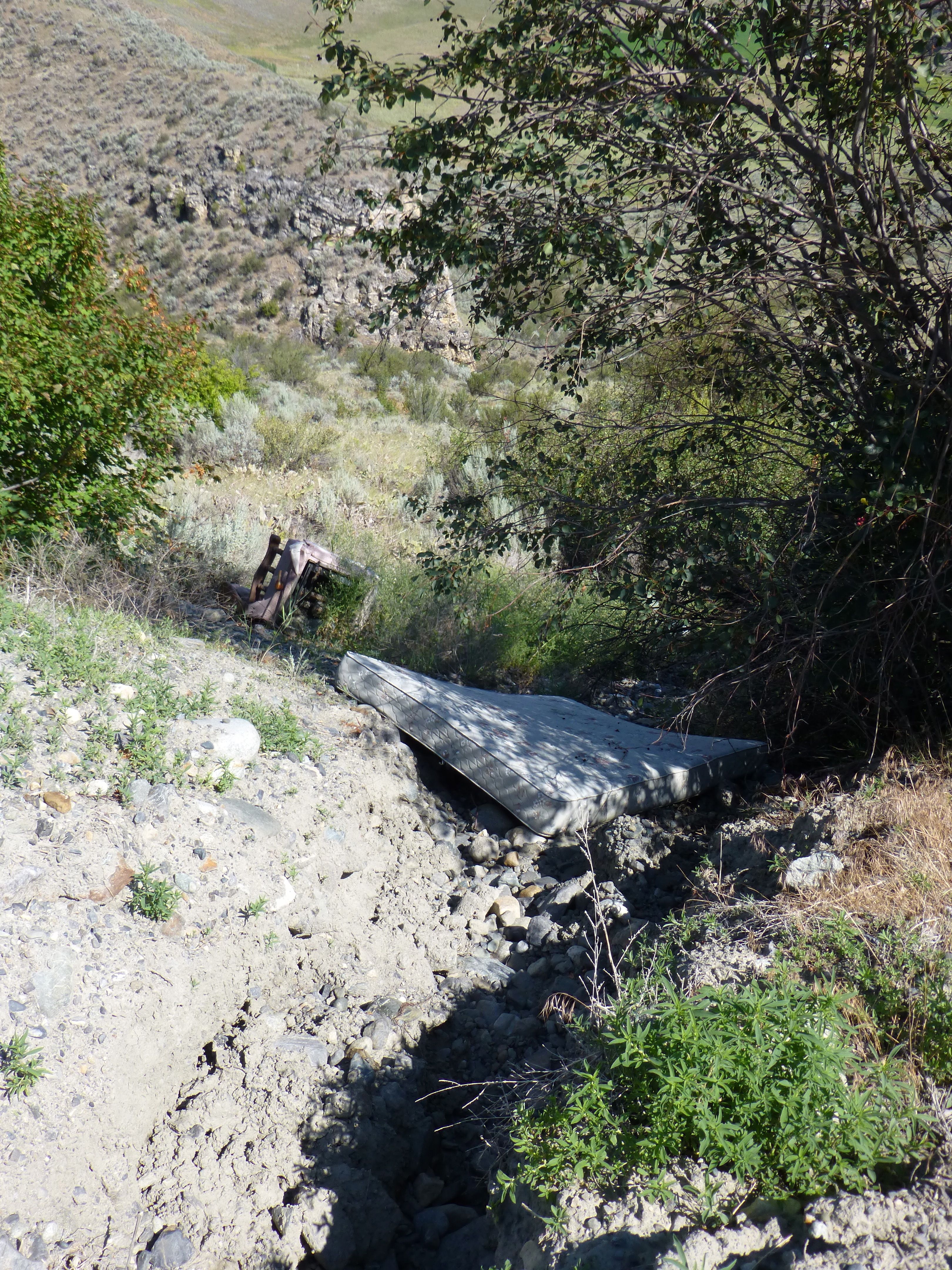 The changeover from natural water to irrigated water came at a cost. In 1901, when the reservoir upstream at Conconully was in the final planning stages, this basin was the site of a murder, over water. In 1903, it was proposed as a reservoir, to complete the Conconully system of reservoirs. The environmental cost of the changeover from natural water to engineered water, however, continues. Here’s a shot of our saskatoon bush, in its new environment, the one in which water is so misunderstood that engineered artifacts are cast away into it, as if it were a useless part of the universe and a great receptacle for trash…