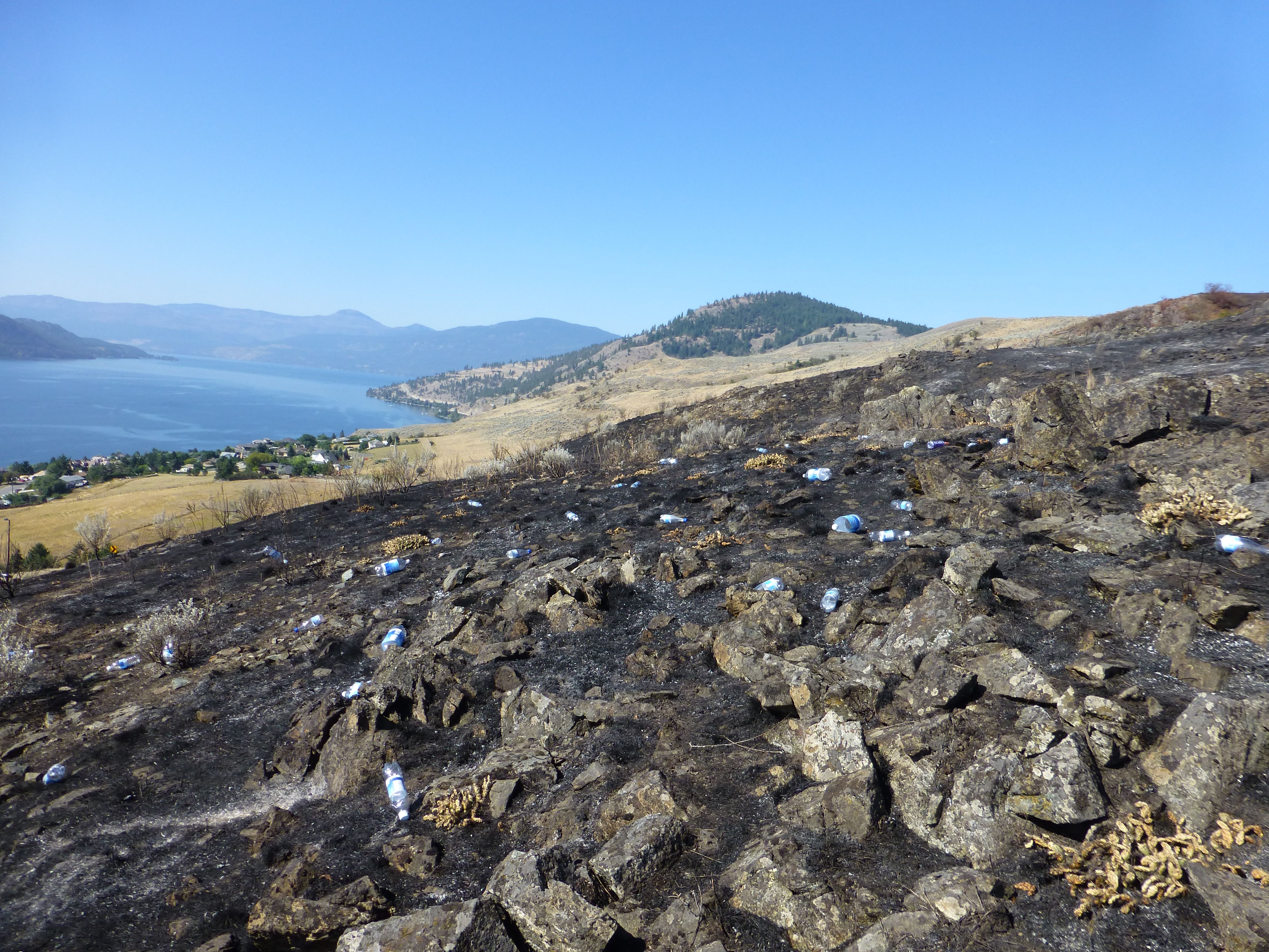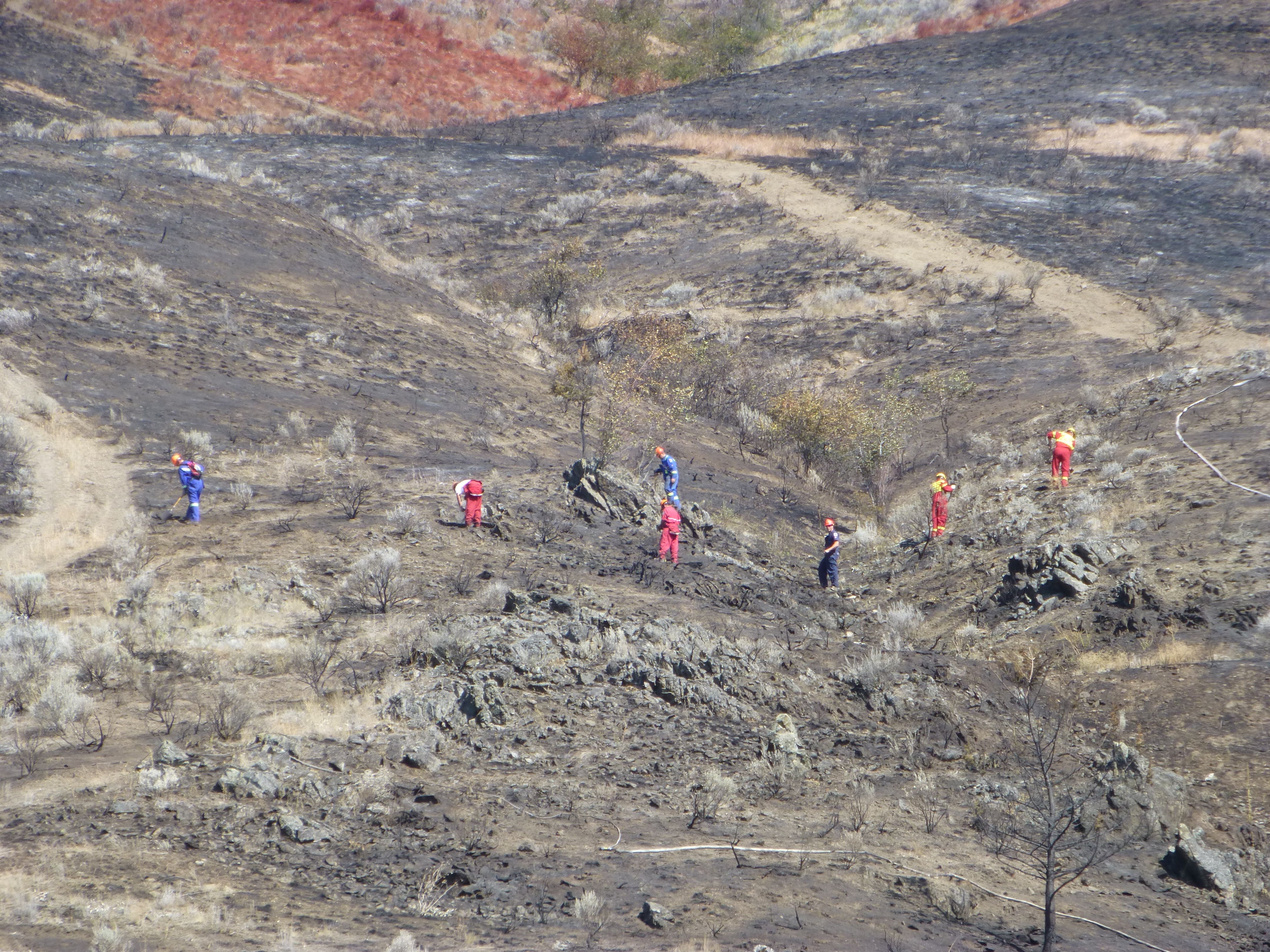 Bit of a grass fire here the other day. Young guy with a lighter. Wondered what it might do. Found out. Too many generations since there was fire here. Hard to remember to tell kills everything. Poof. Fire threatened to go rogue and take out some houses. Evacuations. Water bombers and spotter planes circling above my house in the afternoon. Helicopters scooping up water from among the ski boats on the lake below. Cheatgrass went up like spilled fuel barrels. Video here. In the end, due to the amazing performance of a host of firefighters and some men who really know how to fly, only sixty acres of grassland parched. Fried to a crisp, though. Rattlesnakes and firefighters were battling for their fire hoses and their helmets. Today, men are up there chopping at roots (with a wary eye kept out for rattlers), because the fire has gone underground here and there. I went up to see what a cheatgrass fire could do to a landscape. Well, this, for one…