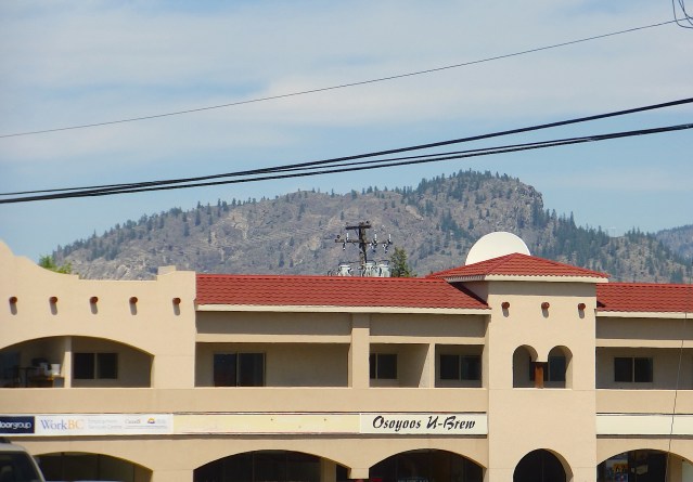 To honour the Portuguese who fled a revolution to come to Osoyoos in the 1960s, and took over the up-to-then German and now Sikh orcharding industry for a generation, Osoyoos advertises itself as the Spanish Capital of Canada, hence the little architectural touches from Capistrano. Portuguese? Spanish? Capistrano? It’s bizarre, I know, but take a look at the horizon. That’s a Syilx ancestor back there. Looks like a mountain, but that’s only half of the story.