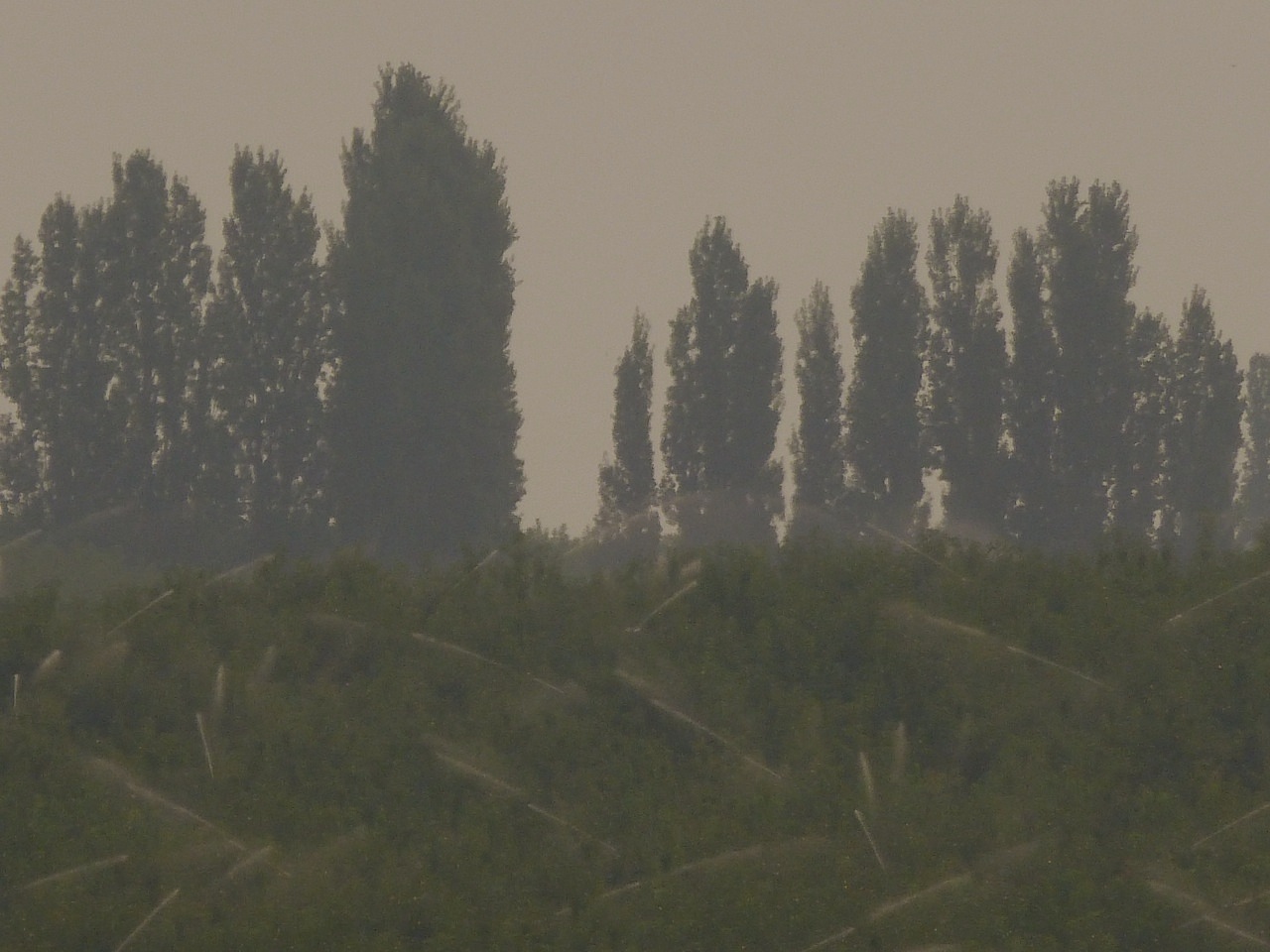 In a hot, near-desert climate of super-dried air, irrigation like this doesn’t just irrigate the roots of the trees. It also changes the climate.