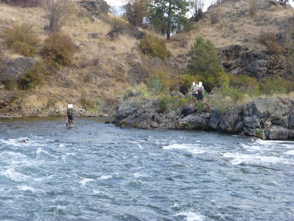 These men were camping at the Provincial Park just down the road from this ancient salmon fishing site. It used to be a Syilx camp, but then it was made an official provincial park, as part of a program of regulating camping, which sounds a lot like a program for regulating Indian camping. It used to include a picnic site, but who’s going to pay for that, so now it’s open to anyone with a tent and $21 a night to spare. Yeah, that’s a fish in the wader’s hand.