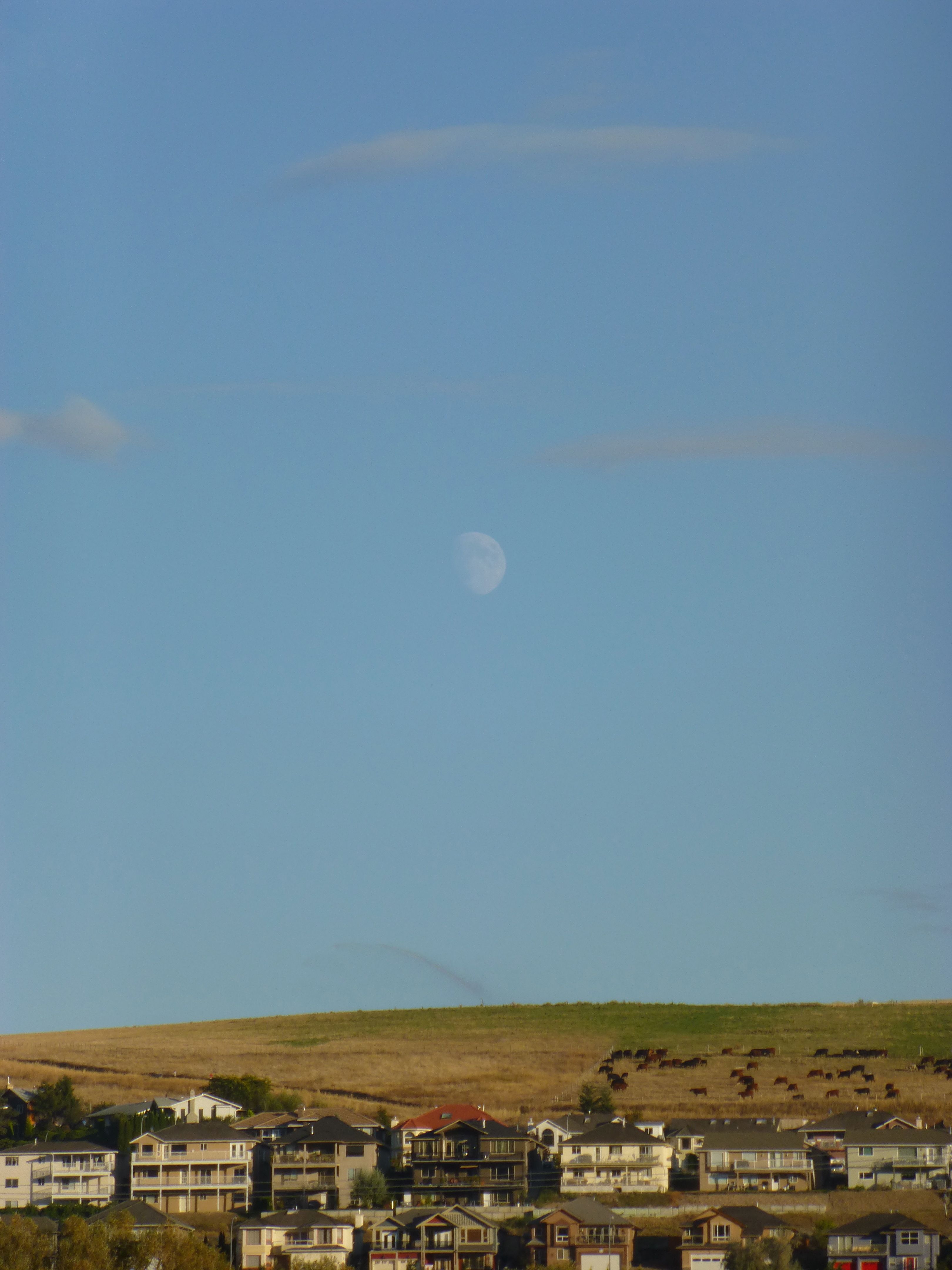 Moon, Sewage Water Sprinkler, Clouds, Sky, Late Afternoon Sunlight, Cattle, Land Claim, and Houses in Vernon, British Columbia