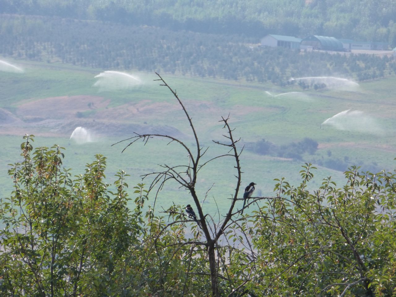 In many ways large and small I have learned this past year just how “White” history is here, and that includes the fruit growing history that is my own heritage. It goes from the official transformation of the first priest in this country from the Father of a community of retired métis Hudson Bay Company trappers and a man committed to adapting Catholicism to native traditions, to a kind of Johnny Appleseed who brought a horticultural garden of eden to the wilderness, to the image above, which shows land that was cynically set aside to be held in trust by both native Syilx people and white ranchers until such a time as an agreed-upon solution to its ownership could be found. In 1895, though, the ranchers erased that contract, and the land has been in land claim ever since. Right now, it’s watered with the outflow water of the Vernon Water Treatment Plant and grows seedling trees for the B.C. forest industry. That industry, living off of weedy-ingrowth into formerly grassy and productive native feral agricultural space, has been bankrupted by the Western Pine Bark Beetle land other pests encouraged by over-mature, weak, single-species forests and global warming, while the ability of the grass itself to produce wealth, and of plants, such as the magpies’ beloved chokecherries, goes unremarked, while the farming industry turns its sights on genetically modified apples that will compete, so the philosophy goes, on a world market oversaturated with apples, by not turning brown. And so we’re right back to the Grand Coulee Dam and the technology of Hanford. It all comes down to …