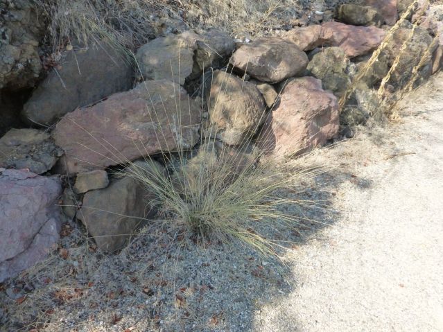 There’s a reason for that. The old stems of this grass are stiff, woody tubes that collect rain and dew, if there is any, and even fog, should the winter bring that, from a large area around the heart of the plant. They then deliver this water by gravity to the plant’s heart. This inverted umbrella also prevents competing plants from establishing themselves in the space between bunch grasses. As a result, a bunch grass slope looks like this…