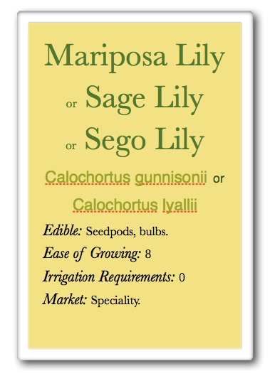 In open agriculture, indigenous crops take their rightful place as efficient water farmers on dry hillsides. One of the most beautiful of these crops is the mariposa lily. In most parts of its range, it is a white lily, with a dark centre, but here it has a colour all of its own …