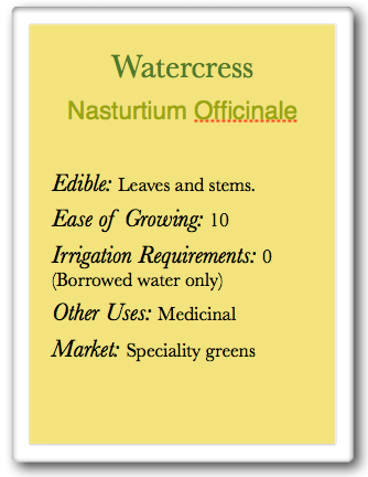Not only does watercress make exquisite sandwiches and salads, but it contains significant amounts of iron, calcium, iodine, folic acid, Vitamin A and Vitamin C. It is a source of antioxidants, a diuretic, an expectorant, and a digestive. Claims have been made for cancer-suppressing qualities, especially against lung cancer and, perhaps, breast cancer. When mixed with vinegar, it forms an ancient Jewish remedy against bleeding. Not bad for a salad! The Okanagan is one of the places in the world in which watercress is eager to grow wild and free in the wetlands that are the twin of the dry hillsides that gather most of the attention. Water supply is not an issue for a plant that lives in it and passes it on. And to think that it is commonly treated as a weed!
