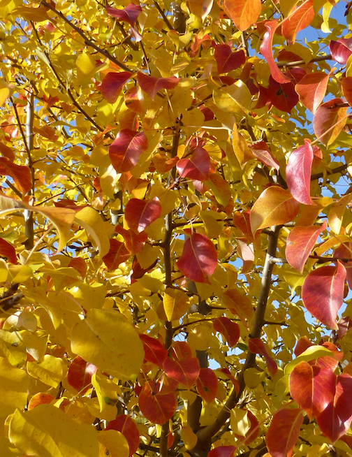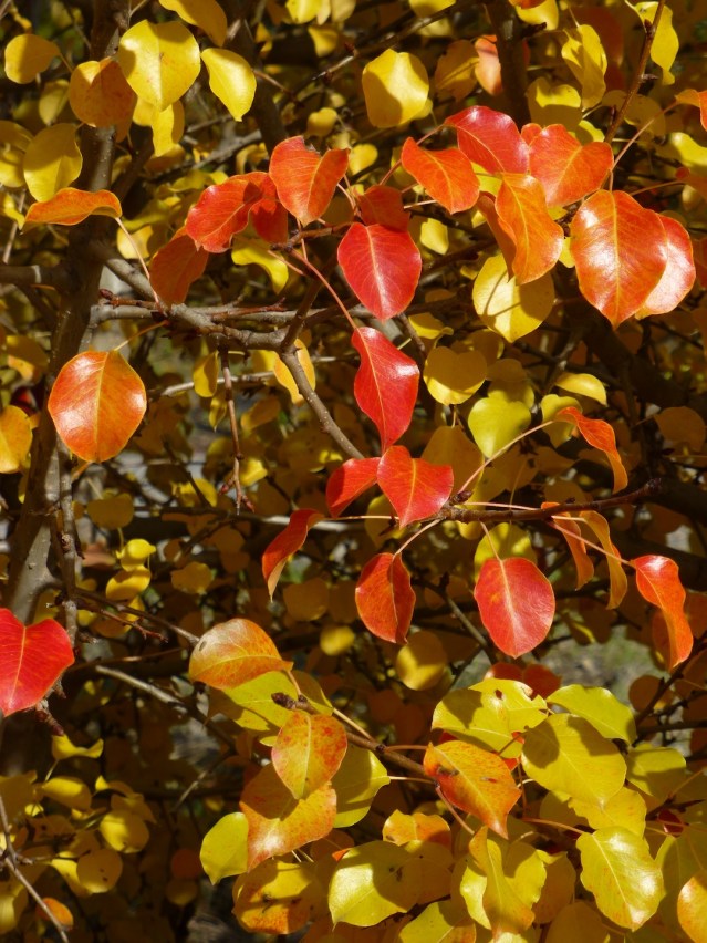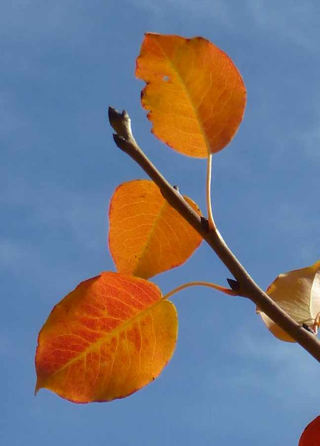 Think of this: cholorplasts, the photosynthesizing cell structures within leaves, are traps for light. They are intricate structures, which reflect, over and over again from numerous precisely-placed reflectors, any photons of light that enter them. In each reflection, the light is aimed at a molecule of chlorophyl. At its heart, that molecule is a little animal, a blue green algae, whose genes the plant’s ancestors stole a long time ago and incorporated into their own. It is trapped in a cage. One photon of light in 2000 is caught and eaten by chlorophyll, which transforms it into sugars and, among other things, that pear you saw in the earlier photograph. In November, though, the cholorophyll is gone, and the other colours of the leaves are there for all to see: