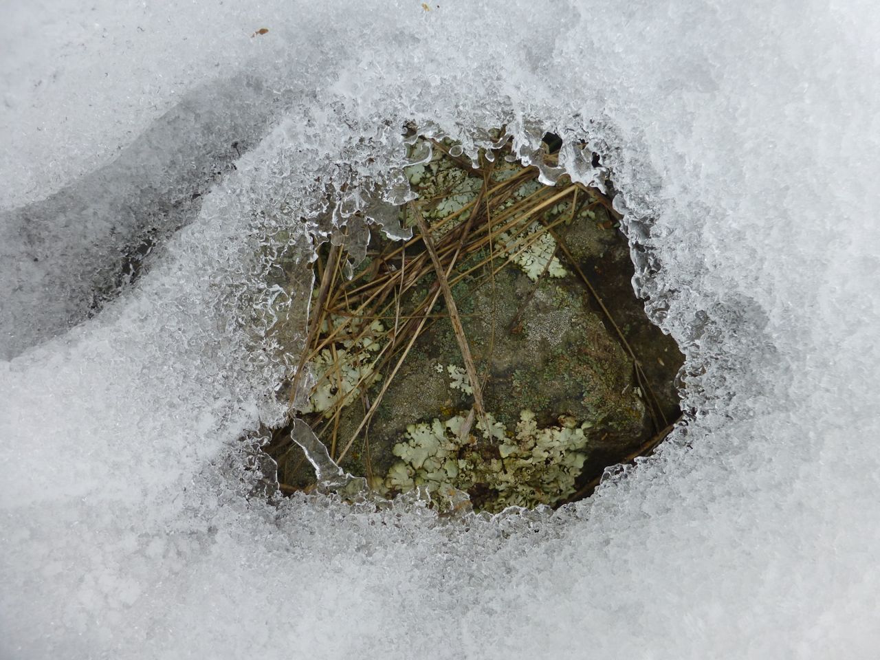 Lichens survive well in extreme climates, such as the Arctic (and the arctic conditions of a valley winter). These complex symbiotic organisms are ancient combinations of algae and fungus that were among the first creatures to move from the ocean to dry land. The date is controversial, but conservative estimates put it at 675 million years ago. The snow here is not acting as a cooling agent but as a greenhouse, providing essential moisture, letting through light, and concentrating heat. This photograph was taken 8 days ago.