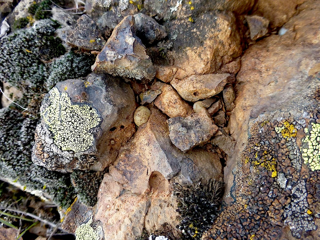 The lichen on the piece of breccia at the bases of these grasses is surrounded by other lichens, that have anchored themselves to tiny bits of rubble, and yet others, that form a crust on the soil, in which grassland seeds lodge and then sprout. Many grassland seeds will not sprout without this matrix.