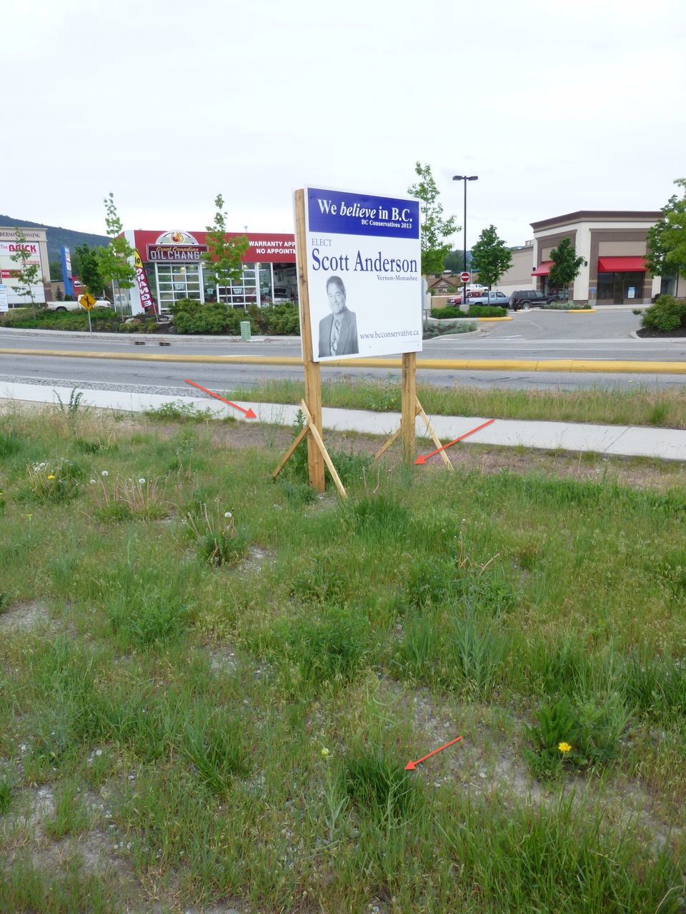 Up to this point, politicians have largely been the kind of people who choose weeds. I’m not kidding. I found three election signs today, all hammered into the northern flanking motion of hawk skeleton weed in the valley, the number one threat to the long-term viability of the Okanagan Valley. It makes almost every other species here an endangered species — and not in some unforeseeable future. Obviously, the people working for these politicians did not know that there is evil, or that it must be dealt with now, not with talk or pounding in signs, but by doing the real work. In my speechlessness, I offer red arrows to show where the largest of the weeds (769 individuals in total) are …