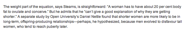 The intriguing phrase is “…found that shorter women are more likely to be in long-term, offspring-producing relationships [so far, so good] — perhaps, he hypothesized, because men evolved to disfavour tall women, who tend to reach puberty later.