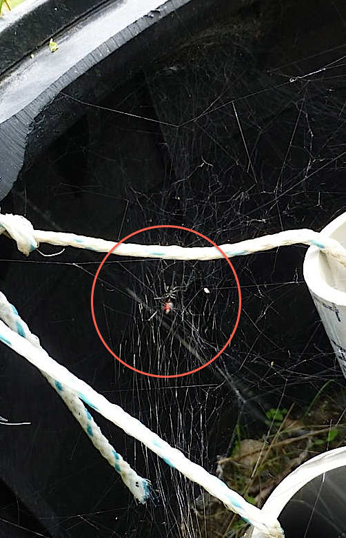 Well, sort of. She flashes that red warning, after all. Note the very, very messy web. I have a few of those in my tomato patch, and another in my garden shed.