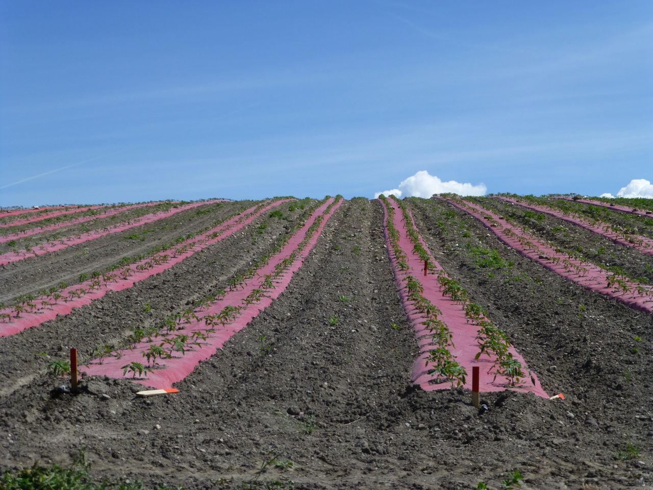 Lots of plastic waste at the end of the season, and ever-declining soil environments caused by heat and non-replacement of cooked-off organic material, but, hey, business is business. The red’s an artful touch. It is laid on a slope to gather the sun, but without regard for the gravitational effects of water and nutrients in the soil atmosphere below.