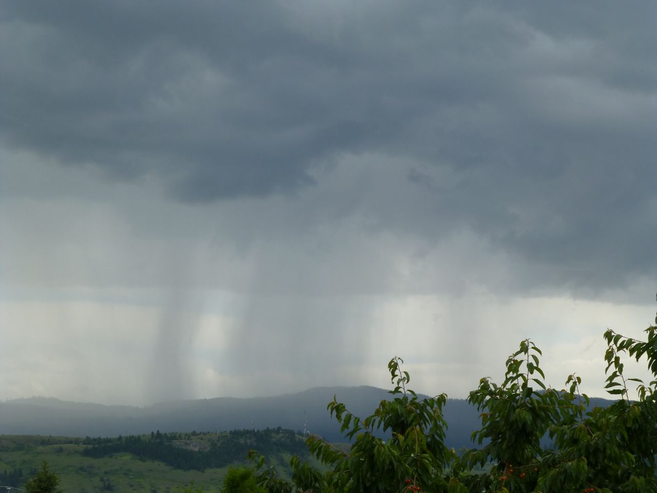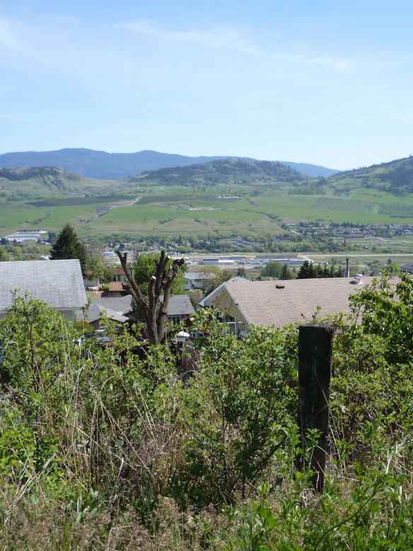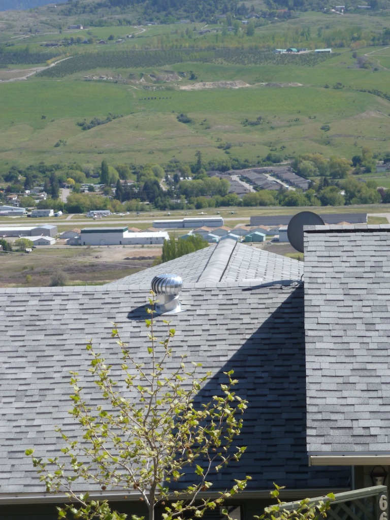 Hence the British Columbia Government is moving forward on another dam on the Peace River in the cool British Columbia north, to supply the power needs created by the lack of creative thinking. Wealth can destroy thought. Exciting trivia for you: that’s the Okanagan Okanogan spruce tree and septic system relief valve right behind the brown roof, in line with the foreground fence post. Every bird going by uses that tree, and at least two species nest in it. Unfortunately, it’s too far from the house to provide cooling shade.