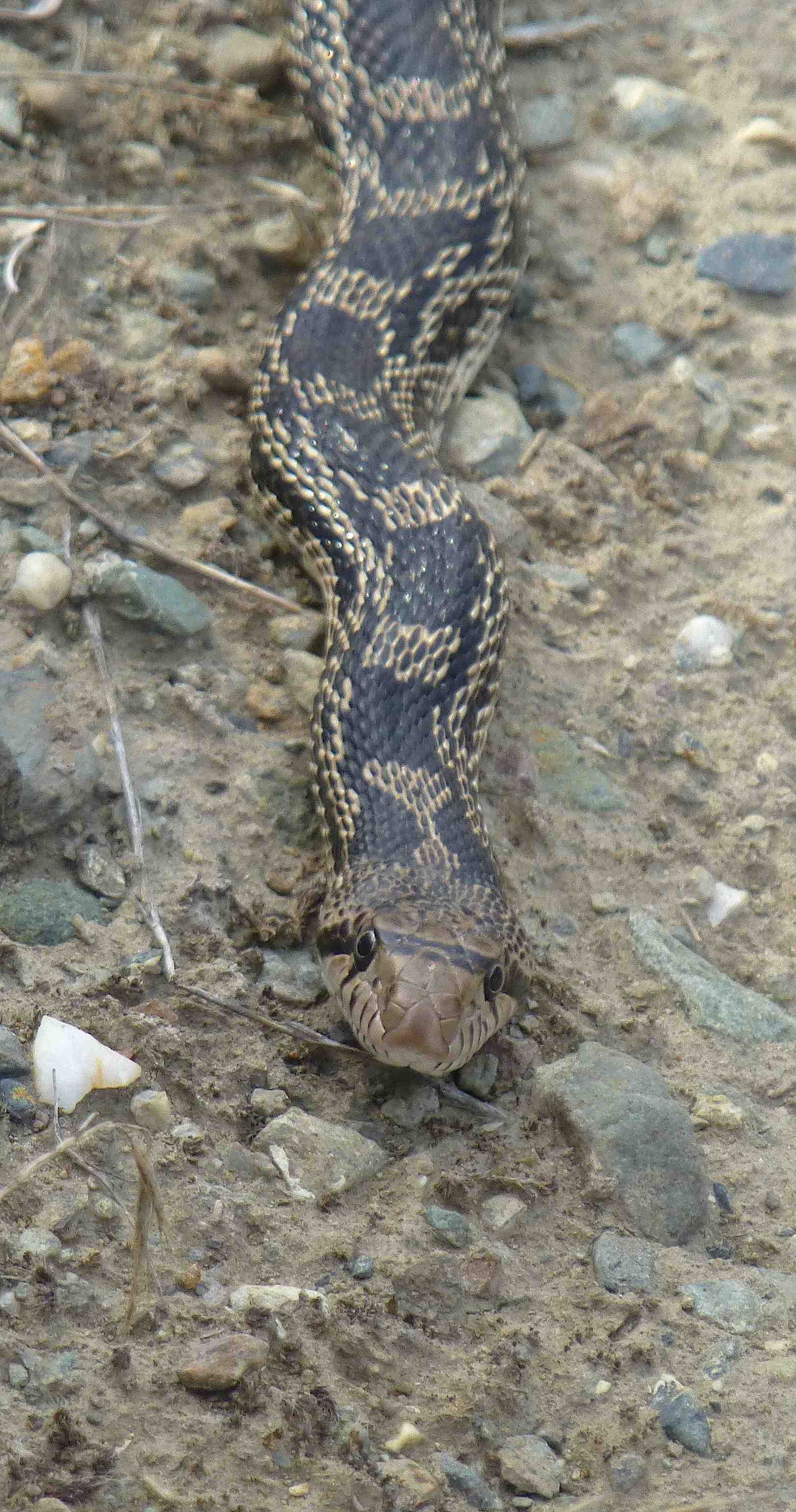 • Not to worry. It’s a bull snake. His ancestors put a lot of effort into looking like a rattlesnake. When frightened he freezes. When REALLY frightened, he hisses, and it sounds a bit like a rattlesnake. Then he’d do a sidewinding little dance to really fool you. But don’t be fooled. It’s just the biggest bull snake I’ve seen since 1977.