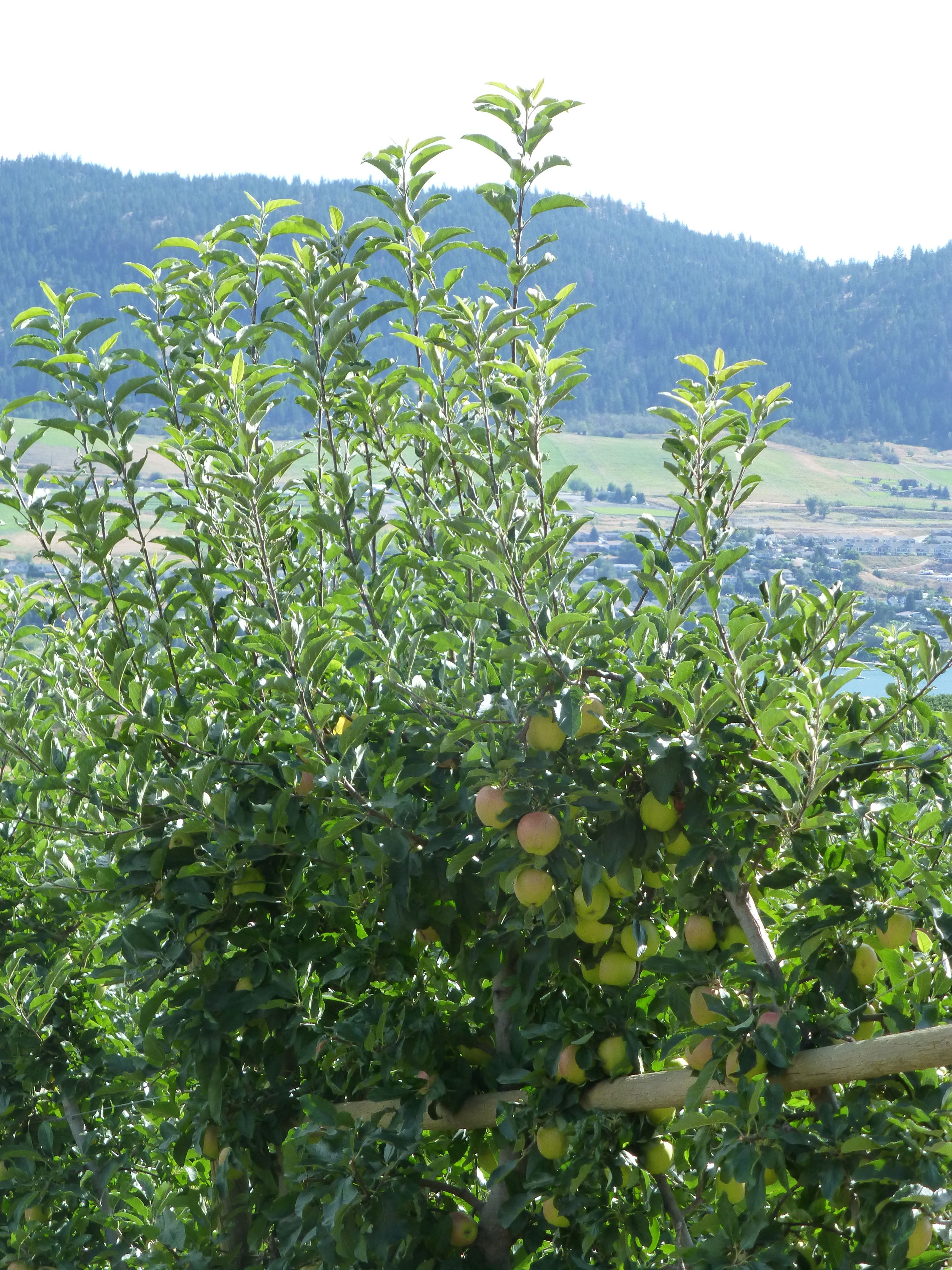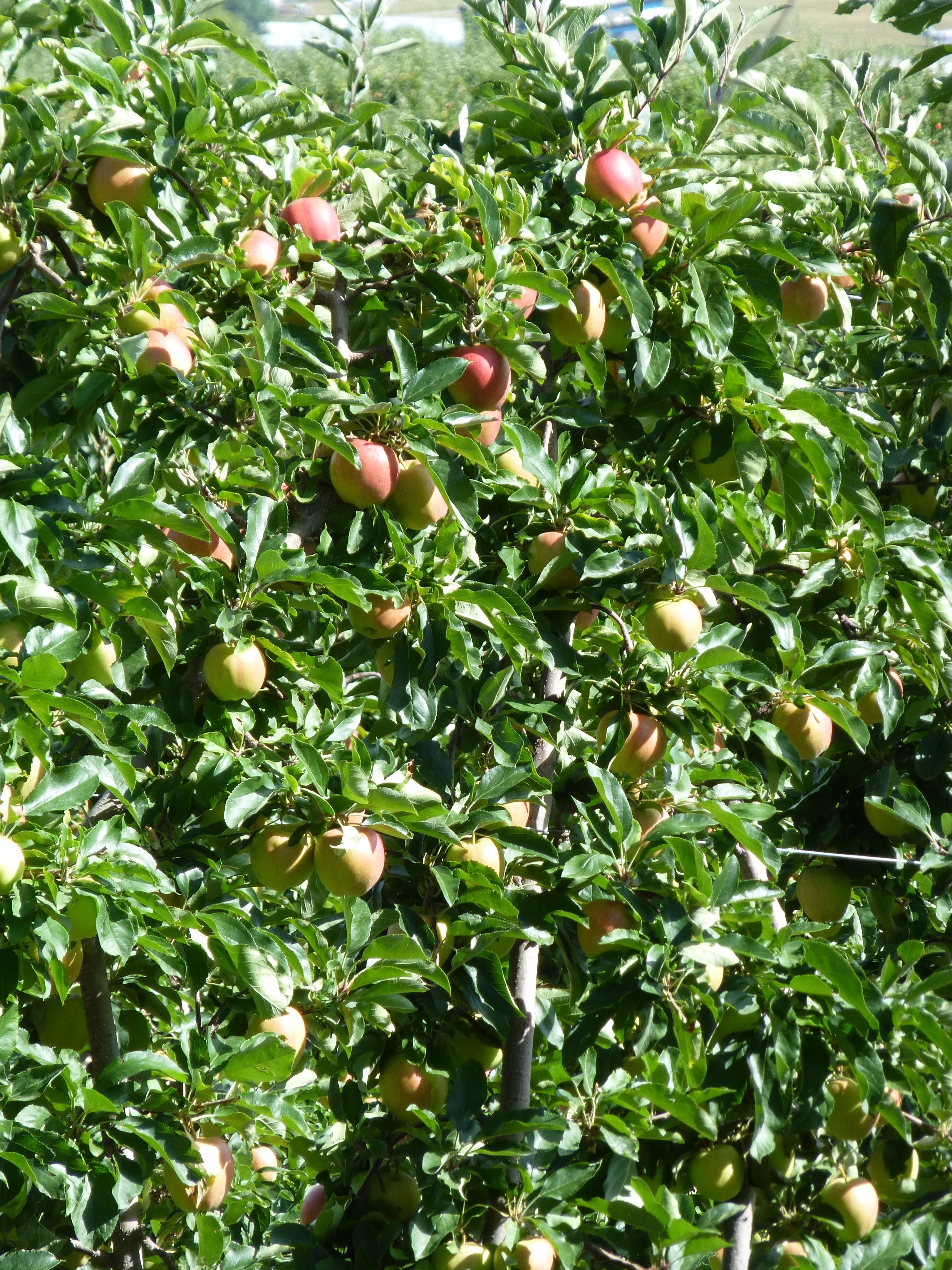 What is an industrial manager to do? Why, prune the branches off of the tree, all of them except for the ones at the top (those come off in the winter, to force sap flow in the spring, to get those large fruits), so that the sun hits the shoulders of the apples and makes them turn red day by day.