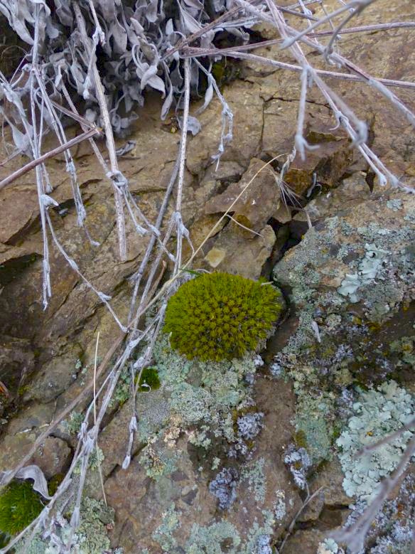 If you’re going to live where it’s cold, mounding your body up creates and stores heat and increases your growth. Notice that this is not a house. In fact, it’s not human at all, but it is an effective way of living in the grass, especially on a stone that is only habitable in the late winter and late fall. But don’t be fooled. The rain washing off of this stone, and the wind blowing over it, spread the spores and bodies of this moss across the entire soil surface, where it forms a thin version of the complex community you see here. That thin biological surface is the earth’s skin. The earth actually breathes through it here. If you break it, the earth breathes out, but not in. Not a good idea. Luckily the mound body is always on the stone, to rebuild broken skin. But it doesn’t have to be a mound…