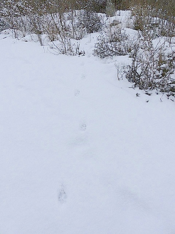 Yes, time is a body. We say that, actually: “A body of time.” In this case, it’s the tracks of a coyote heading up into the hills mid-afternoon today, about fifteen minutes before I trudged along. We could call this a “track”, but look again: the time of the coyote’s presence is here all at once. A dog would read that out of this scene. Dogs (and coyotes) pass through a landscape of time, extended for a few days into the past, all of which is immediately present in fine 4-D, although finely nuanced and layered. Dogs don’t notice. They kind of let their tongues hang out and lollygag along. 4-D perception is normal to them. It’s also normal to people like us, who are humans, but not through smell (we might smell but we don’t smell, if you get my drift). Smelling is what dogs do best. Humans see in 4-D by sight. We see this extension of time as a line of footprints, but only because we’re so darned used to it. It’s not a line; it’s a special dimension of space called time.