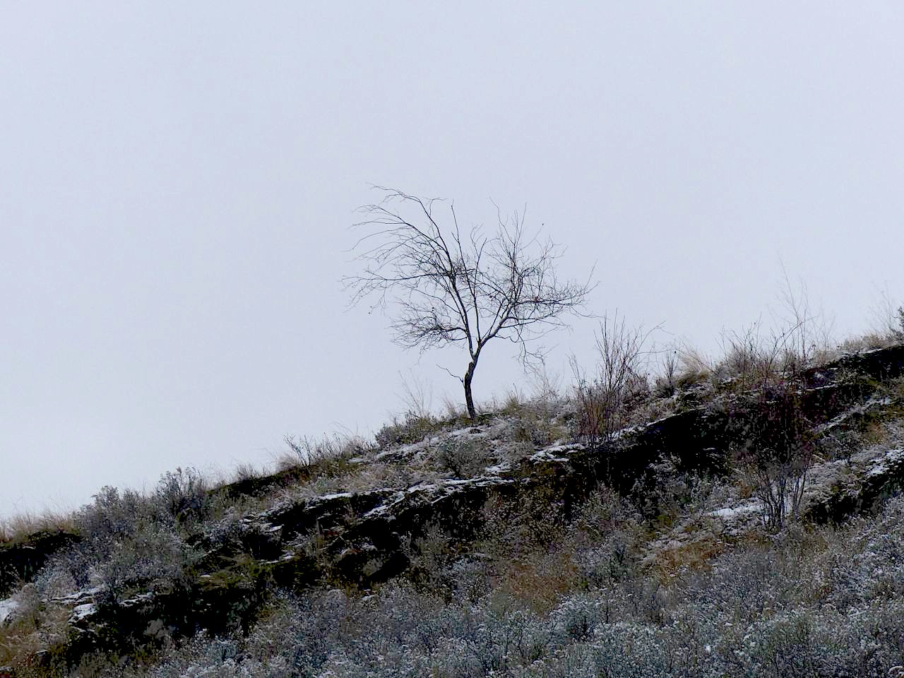 P1060539And here’s the thing: this lone, weather-battered saskatoon is another island in the grass. It is a body that other bodies take on to increase their bodily strength. Like the island of stone I showed you previously, it concentrates life, which departs it for the grass, and then comes back to it. No magpie or flicker gets from the top of the mountain to the bottom (and they love to make the trip over and over again, day in and day out) without stopping on these trees for a puff of breath. Hawks use some of them too. Very handy. A cool factoid: most of these bushes get started in the special wet environment that a stone island has created in the grass. Now, here’s a cool thing about saskatoon bodies and time (about 2 kilometres along the ridge line):