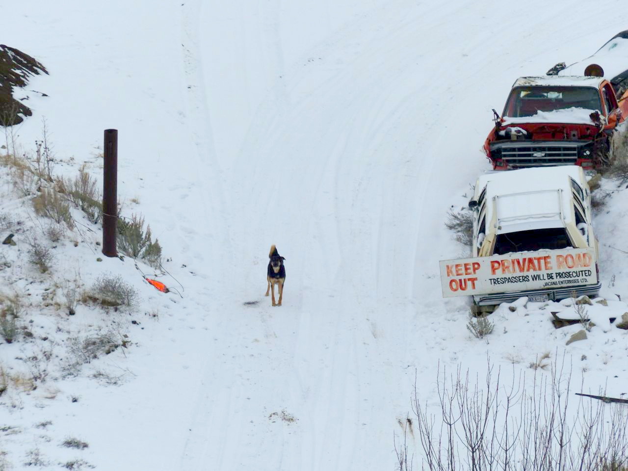 There’s an old Okanagan tradition of strewing one’s property with junked cars and equipment to stick it to creeping gentrification. That dog sure needs to relax a little, though. The way he was going on, he’s going to need throat lozenges, soon.