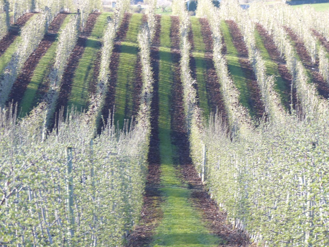 This minimalist installation is called an orchard. Note the narrow band of grass between the weed-killed strips, out of which the apples grow.