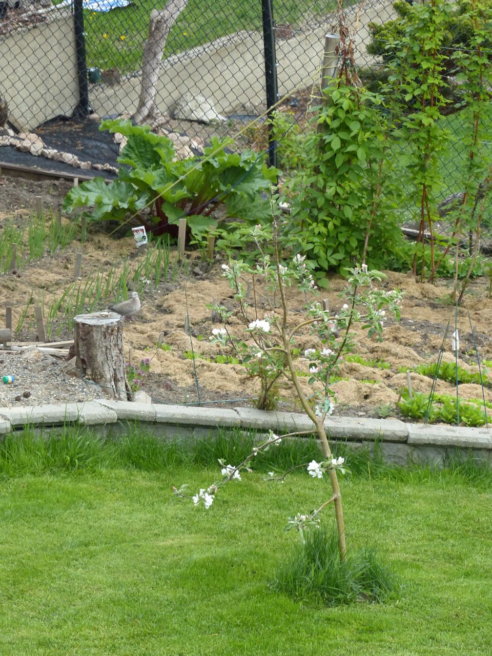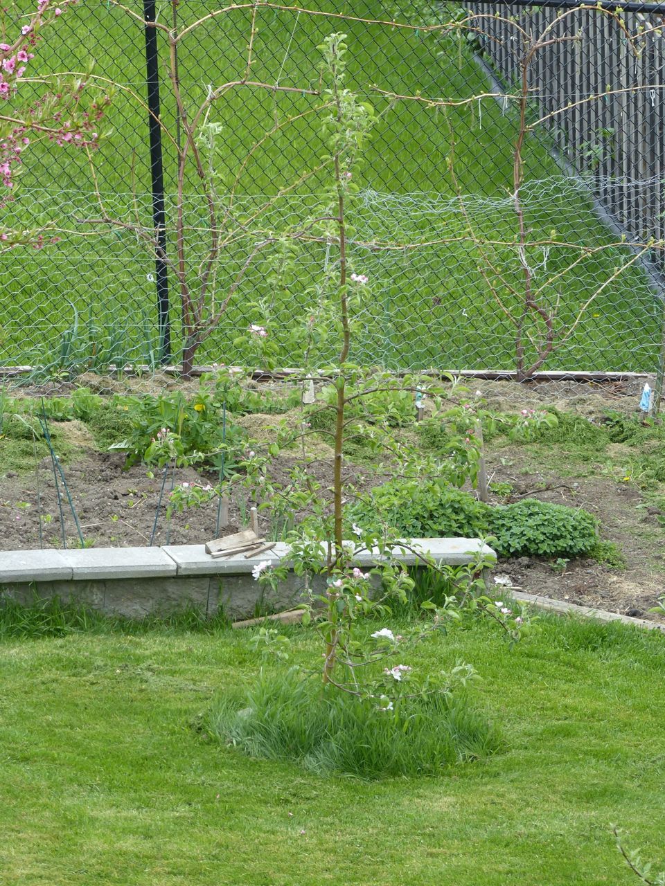 Here’s another example. Here you can see my nectarine tree in flower, and my grapes budding out, as well as sugar snap peas, oregano, self-seeded radishes, perennial green onions, chives, and an apple tree I grafted a year ago. Note the blossoms. It takes two years for an apple tree to blossom, but I encouraged this one to blossom in one year, through a couple techniques of mechanical summer-time manipulation of the flow of its naturally-produced hormones at bud differentiation time (soft-pinching and the weighting down of branches.)