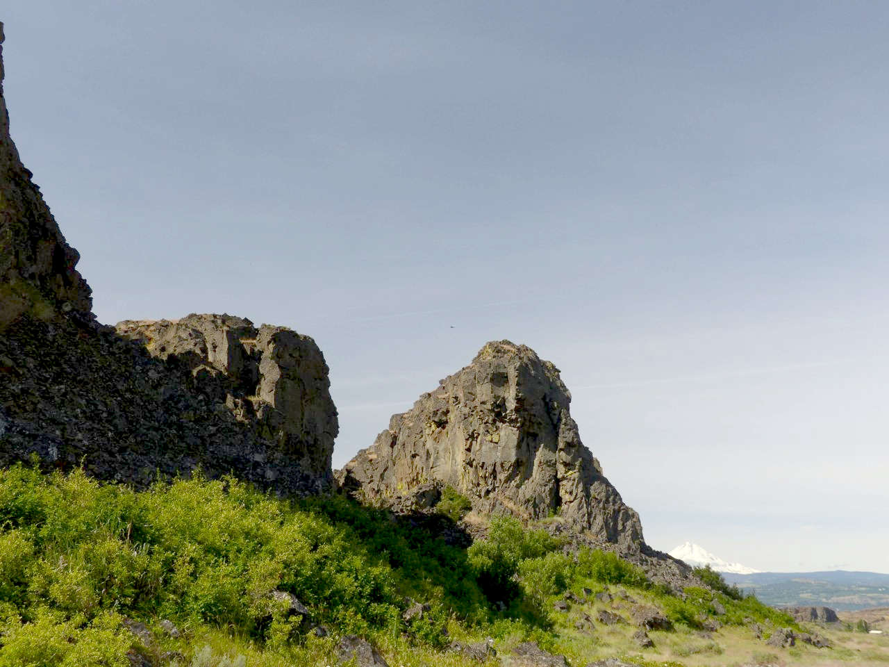 That’s not the only spiritual energy flowing through this place at the centre of the Northwest. Take a look at Mount Hood. She plays her tricks, too. In the image below, she is rising white with snow above the horizon over the back of the Butte. The Butte in the foreground is replicating her energy on a smaller scale. The stack of stones I showed you yesterday repeats it on a smaller scale yet. No doubt, this scale continues down to the size of a grain of sand or a flake of snow.