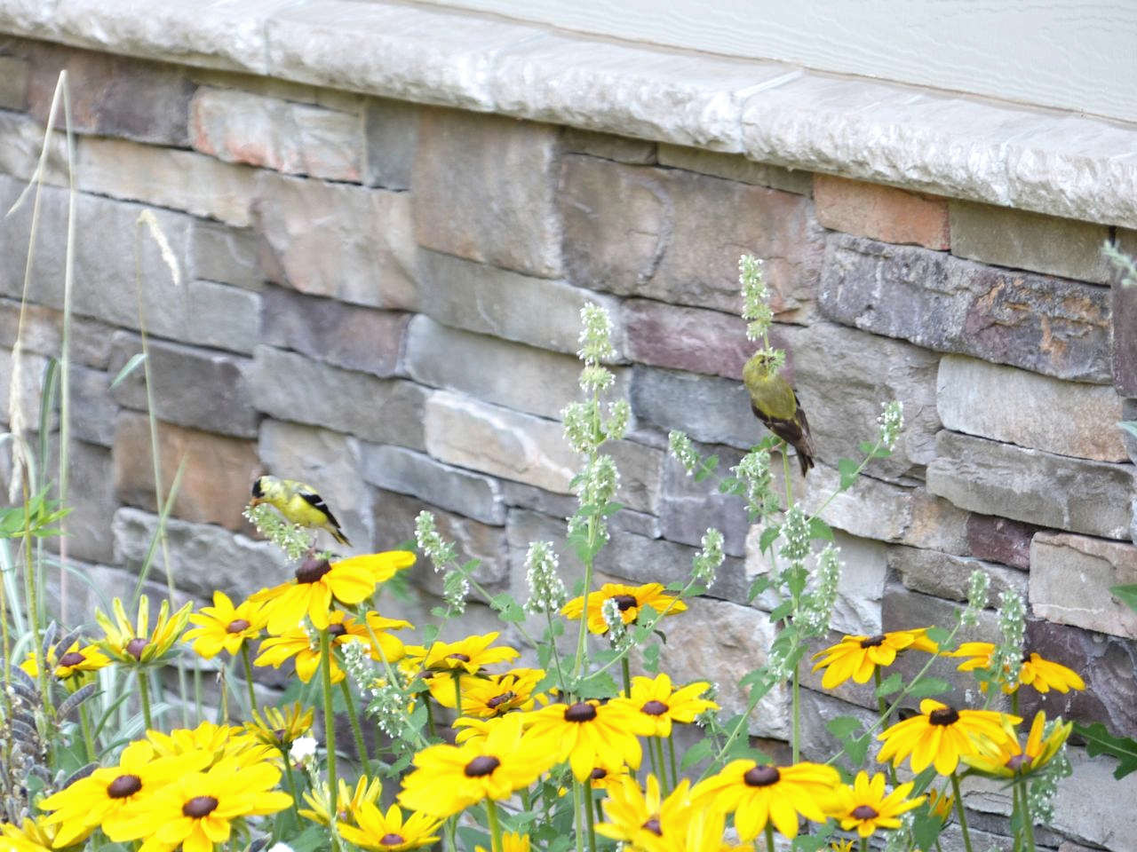 Here’s my front yard. Note the flowers I have planted instead of a lawn. It has been a very exciting place lately. Dozens of species of bees and many species of beetles have been working it for weeks. They’ve all come down from the grassland up on the hill. A big neon-green toad has made her home here, and seems to be getting rich on it. Today, though, was special. Check out the pair of American Gold Finches feeding. They were there for an hour.