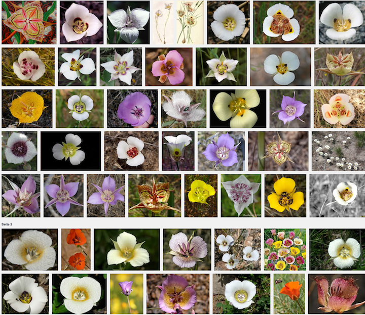 This is the wild grape of Southern France, which has thousands of variations, all farmed, and even appears with differently coloured skin (pinot noir, pinot blanc, pinot gris, pinot auxerois), with all of their different flavour characteristics. This is not a matter of breeding. The genetic material of this ancient plant changes to fit environmental conditions. In fact, change is a major characteristic of the plant. The point here is that within the plant there exists a huge potentiality for variation, which manifests itself in different conditions. It is a lesson to remember when looking at any plant. Here are three variations of mariposa lily growing on Turtle Point in Kalamalka Lake…