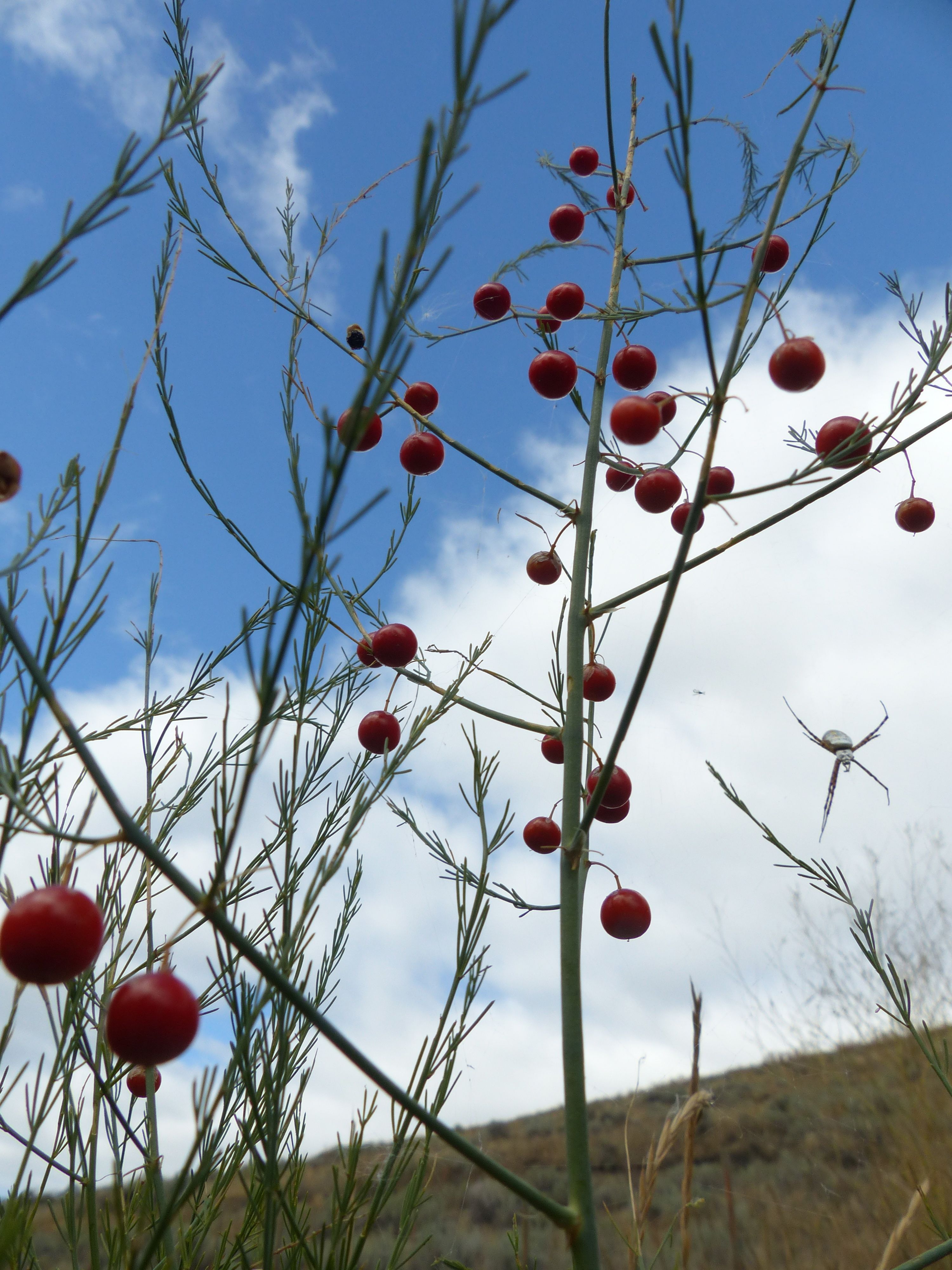 Spiders! An interlude of pure predation, while I work on my next post about science and language. This one is inspired by sticking my head into this asparagus to get some photos of berries this morning and getting a start, I tell you. See her?