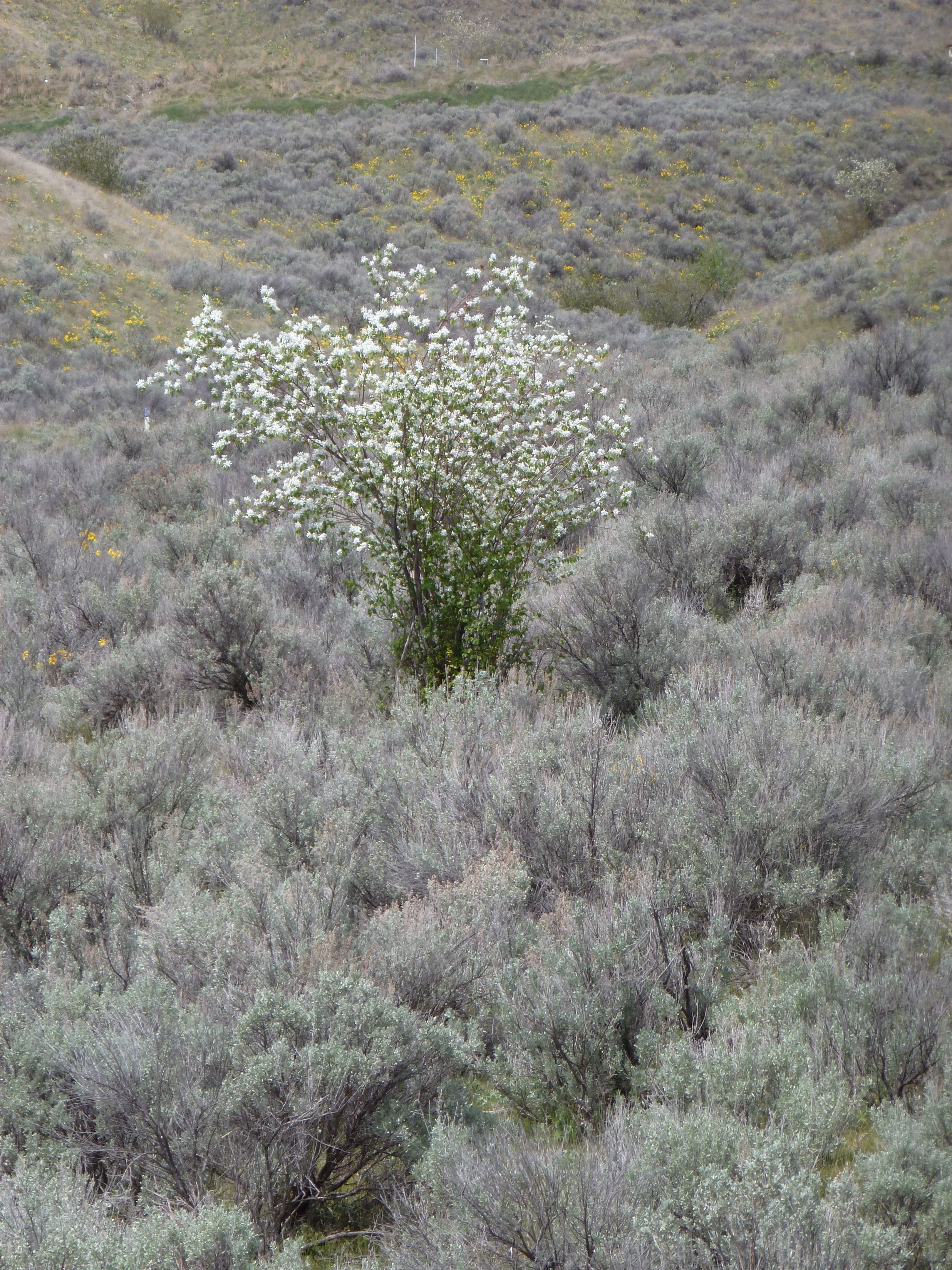 Note how it expresses itself at different heights and intensities through the differing bodies of different species, such as the saskatoon bush here,the yellow balsam root flowers, and the blue-green big sage.