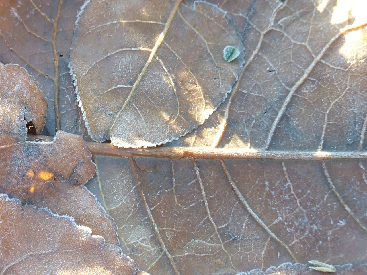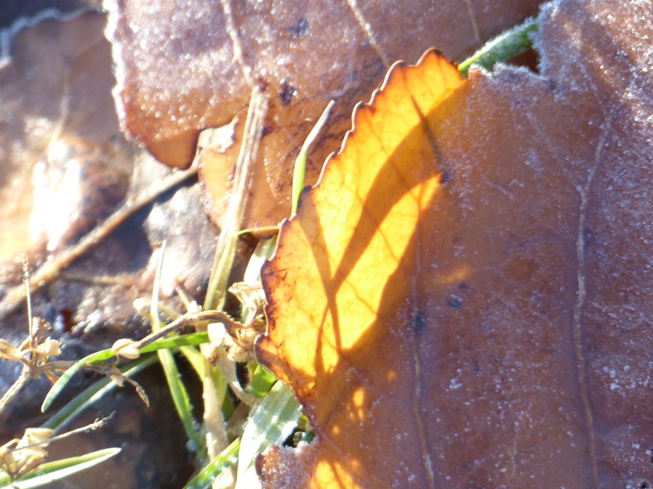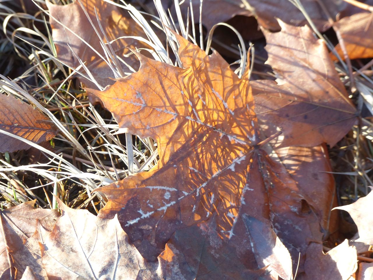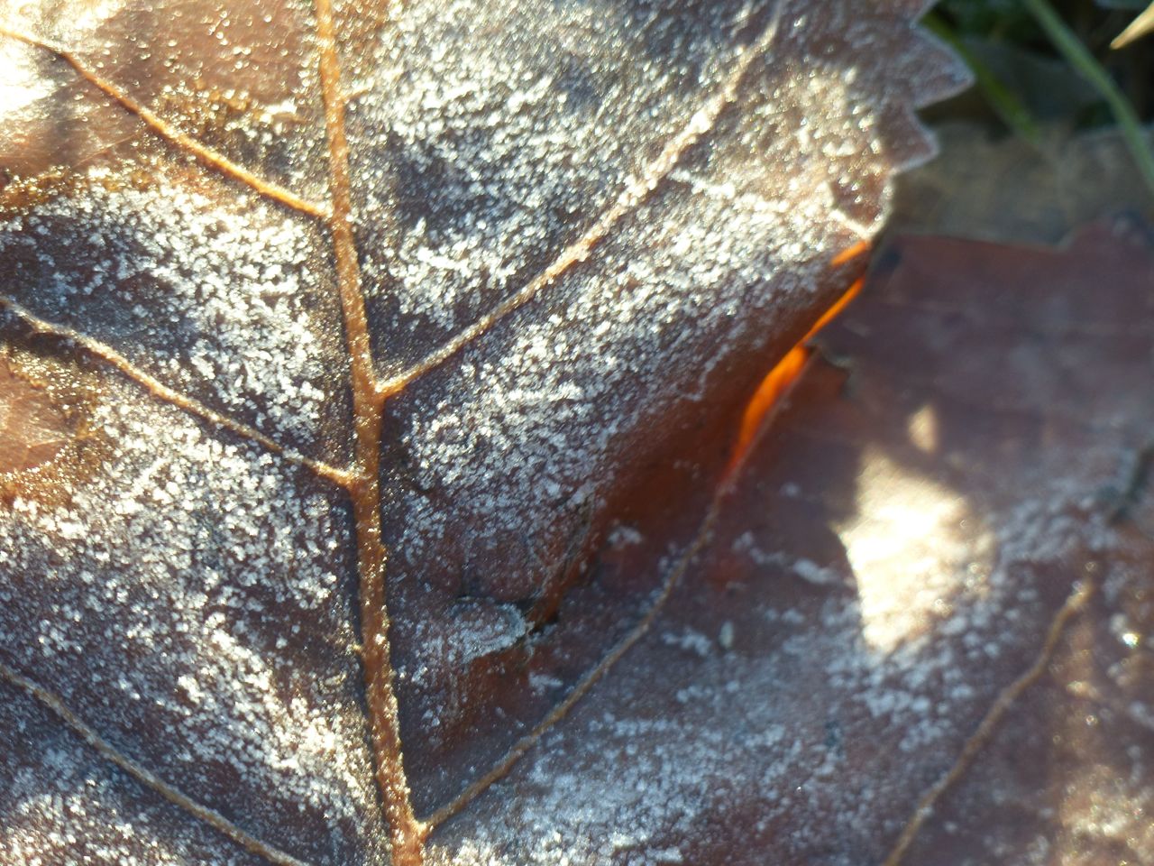 P1590348 In the following image, a little capacity remains.P1590346 If it were summer, this image would be duller, and green, because the algae would be eating the photons that make this leaf so bright.