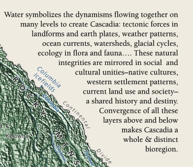 are one landscape. And that’s where both the amazement and the problems arise. Cascadia is sometimes an independence movement, for a new state in Western North America, cobbled together out of pieces of the old pre-1846 Oregon Territory, divided thereafter between the United States and Canada, sometimes an ecoregion and a cultural region, most notably defined as the basins of the Fraser and the Columbia Rivers, and the coastal rainforest zone from the redwoods of California to the archipelagoes and fjords of Alaska. This is salmon country. We could define our country, our illahie, to use the old Chinook Wawa (the language of this place) term for it, as salmon country, and pretty much get it right, but the Cascadia Institute defines it by water. I quote: