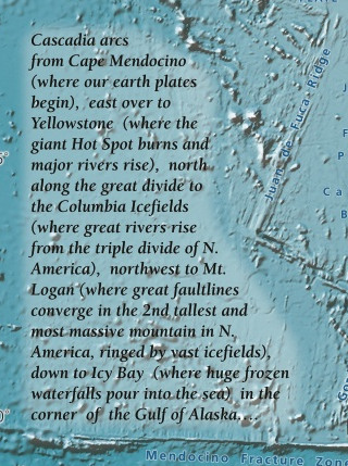… because what the volcanoes do is cause the rain to fall to the West and the air to lift water out of the earth to the East. Until there is a concept that sees those as the same process, Cascadia is a colonial dream from the wet zone, meaning the Willamette Valley, Portland, Vancouver (both of them), Victoria, Bellingham, Olympia and Greater Seattle. It’s not water that defines this region. It’s the volcanoes. They harness the wind to create surface water and surface drought, two opposites bound forever, but it would be as silly to describe the rainforest as being a land of drought as it would be to describe the shrub steppe as a land of water. Fortunately, the Cascadia Institute doesn’t do that. Once it gets its water story out of the way, it hints at a geological story. Again, I quote: